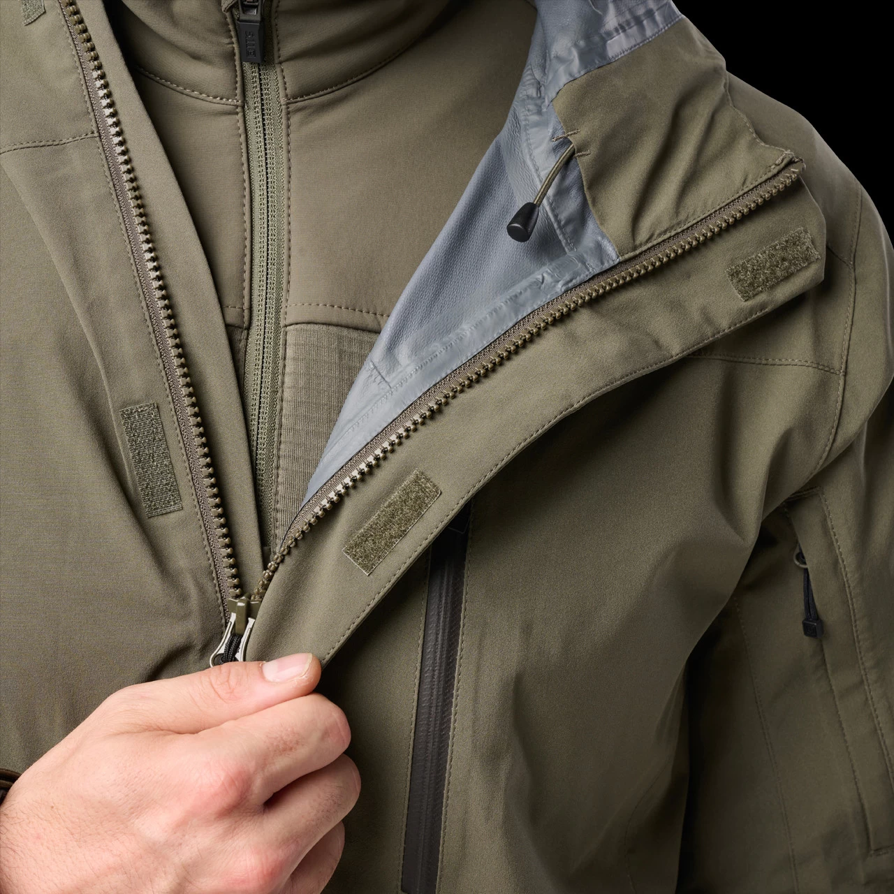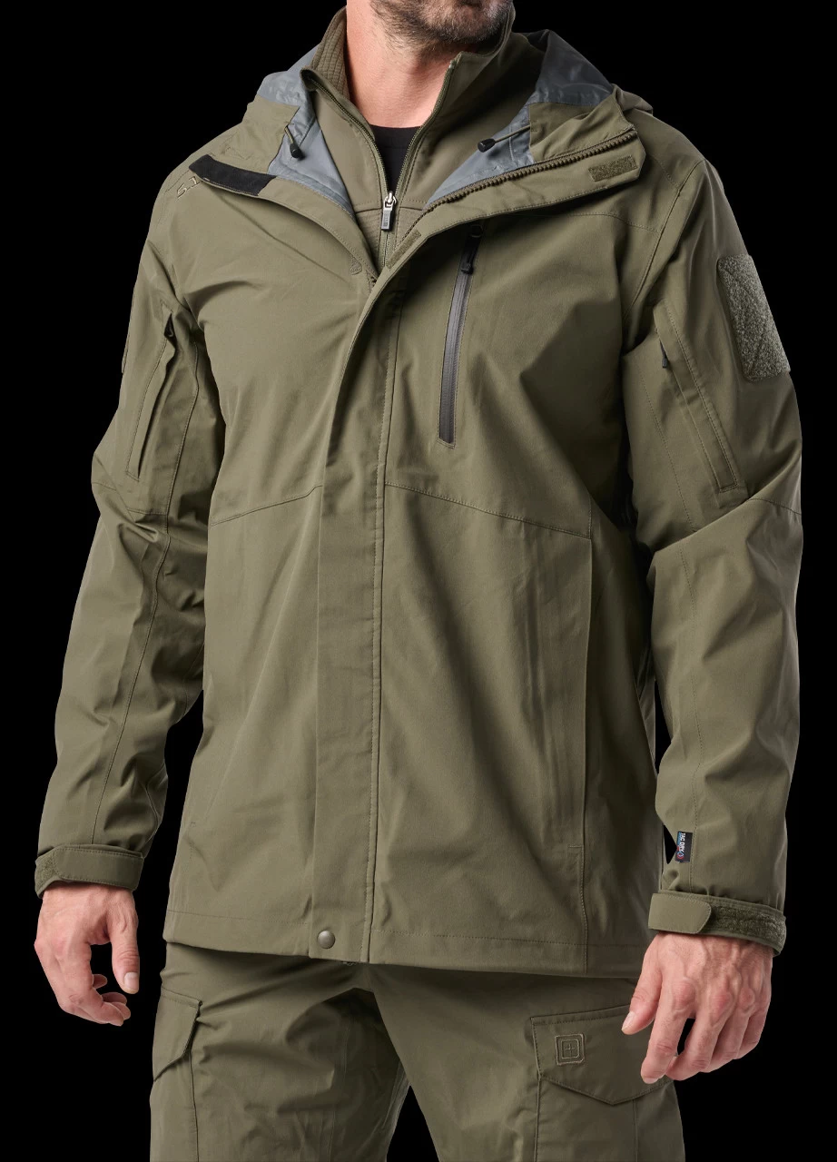 Always ready for the rain, the 5.11 Force Rain Shell is a lightweight highly waterproof and breathable jacket built for wet weather. The shell is EN 343 certified and features a 15K/15K waterproof/breathable Tac Dry membrane with BBP protection. Built with a 2.5L lightweight polyester plain weave and fully seam sealed. The Force has a two-way front zipper with internal and external storm flaps, a stationary hood with reinforced brim and adjustable opening as well as underarm zips for breathability and adjustable hem. Six pockets, including a waterproof left chest pocket with an internal media port. Keep the weather out and yourself dry and comfortable.