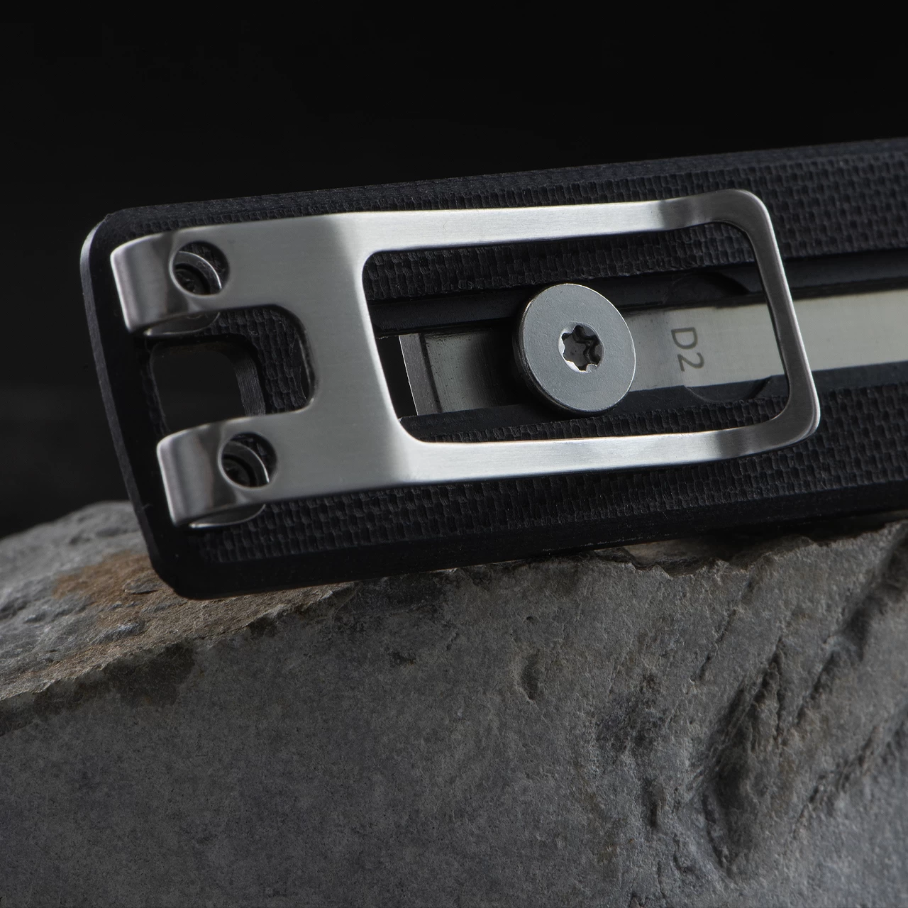 The blade is made from D2 carbon steel which is hard, long lasting and extremely sharp. A removable pocket clip is attached to keep your newest EDC addition close to hand.