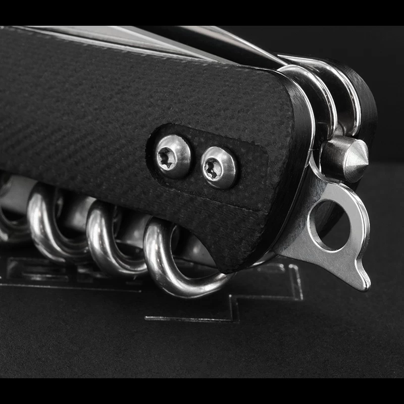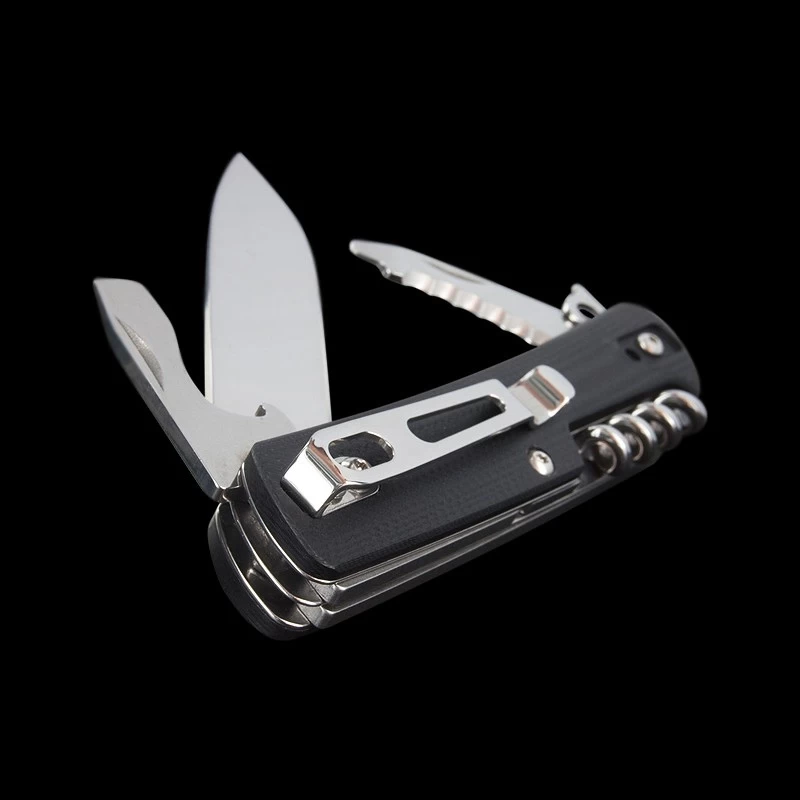 The hollow ground stainless steel, non-locking UK legal carry blade is accompanied by these tools: glass breaker, flat screwdriver with cap lifter and wire stripper, small serrated blade with flat screwdriver, cork screw, lanyard hole, clip.