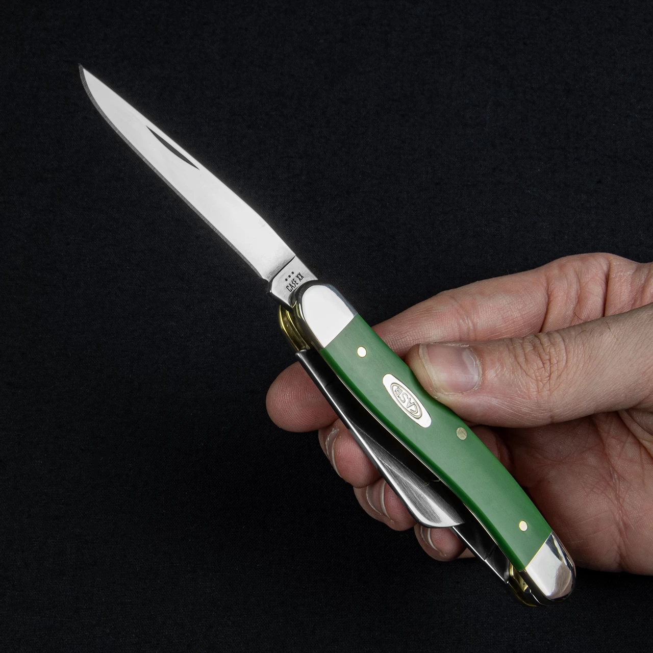 This model has a clip, pen and sheepsfoot blade made from stainless steel. The handle is a smooth green Synthetic bearing the Case shield inlay. Nickel silver bolsters and brass liners provide an attractive contrast. Each blade is under three inches long and non-locking making it legal to carry within the UK at the owners’ discretion
