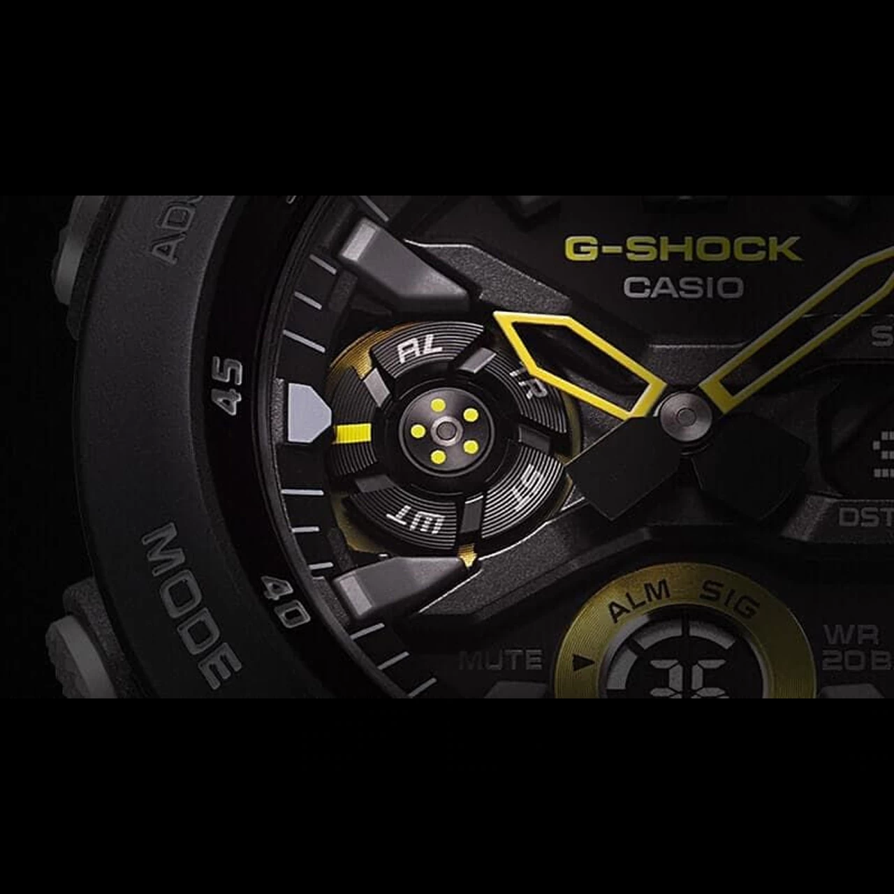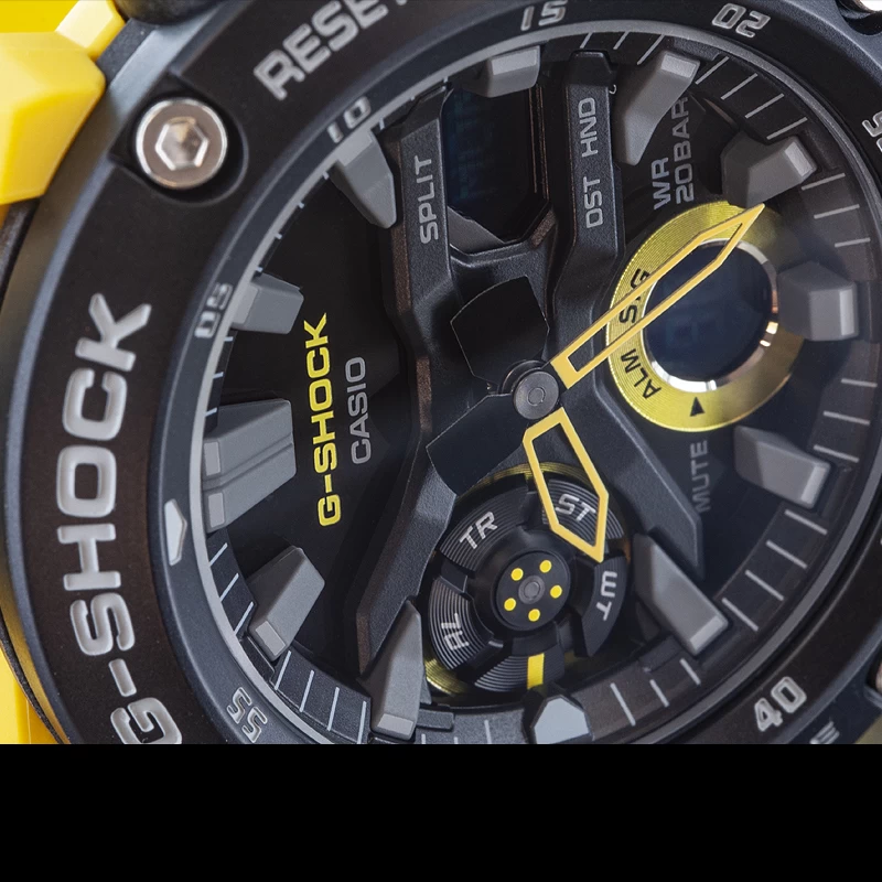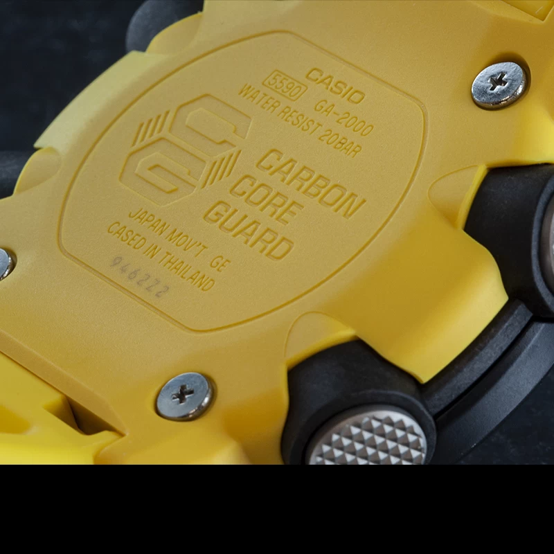 Notable features include a carbon fiber-reinforced case, guardless buttons, front light button, a double case back structure, and in this version a yellow resin band. The Carbon Core Guard gives the GA-2000 a very light weight at 64 grams which is lighter than the GA-100. The display has a 3D index with high-contrast analog hands, LCD subdisplays, and a menu subdial.