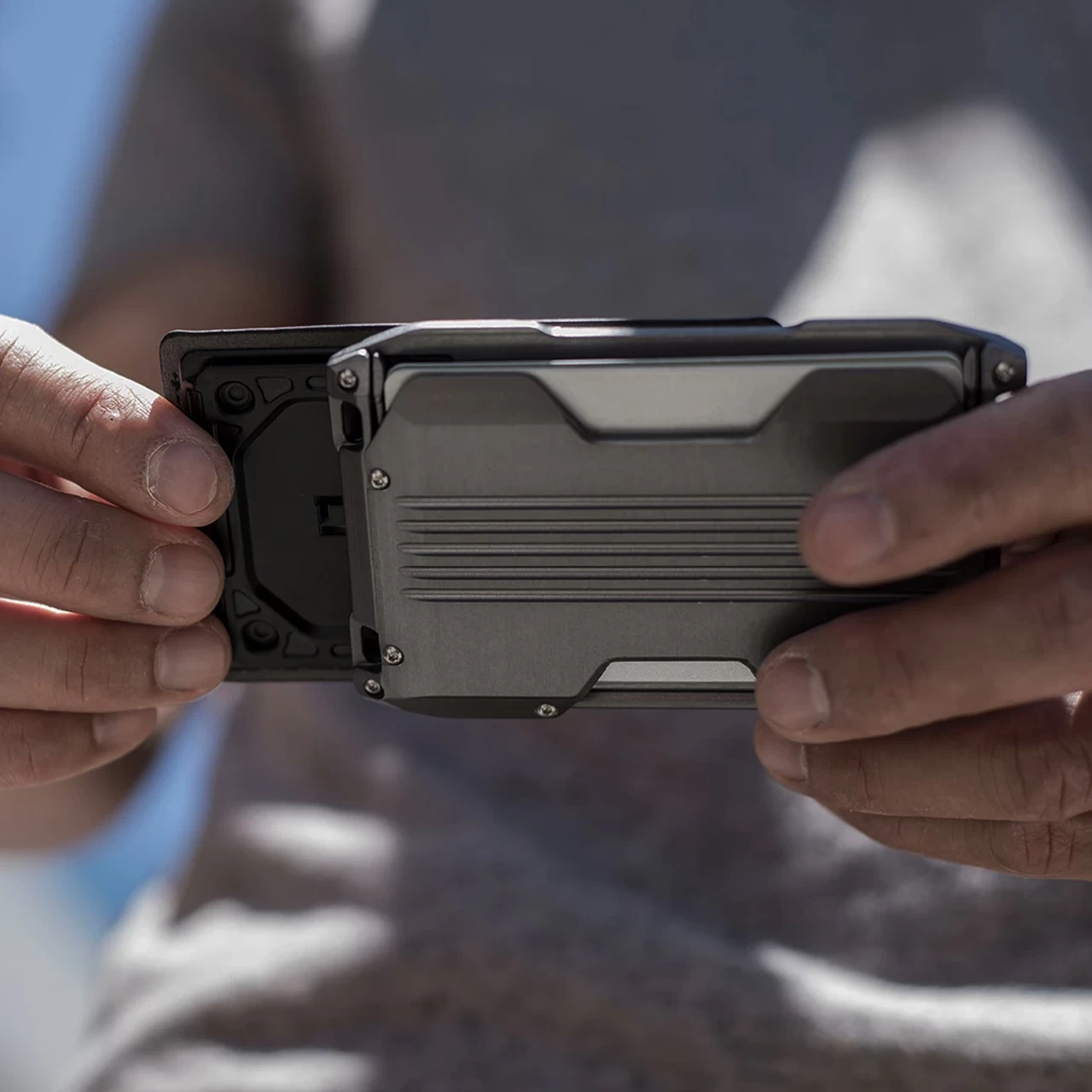 The chassis of the Dango A10 Adapt Single Pocket Wallet is made of machined 6061 aerospace grade aluminium and anodized to perfection. The A10 is equipped with Dango’s popular and unique patent pending quick release rail mechanism on both sides of the wallet that allows easy access to cards while keeping them securely in place. On one side of the chassis is a horizontal cavity holding up to 4 cards that is protected by a removable aluminium RFID plate. On the other side is a single card, vertical oriented cavity meant for displaying identification, badges and any cards that needs scanning; perfect for accessing secured buildings and boarding public transportation.