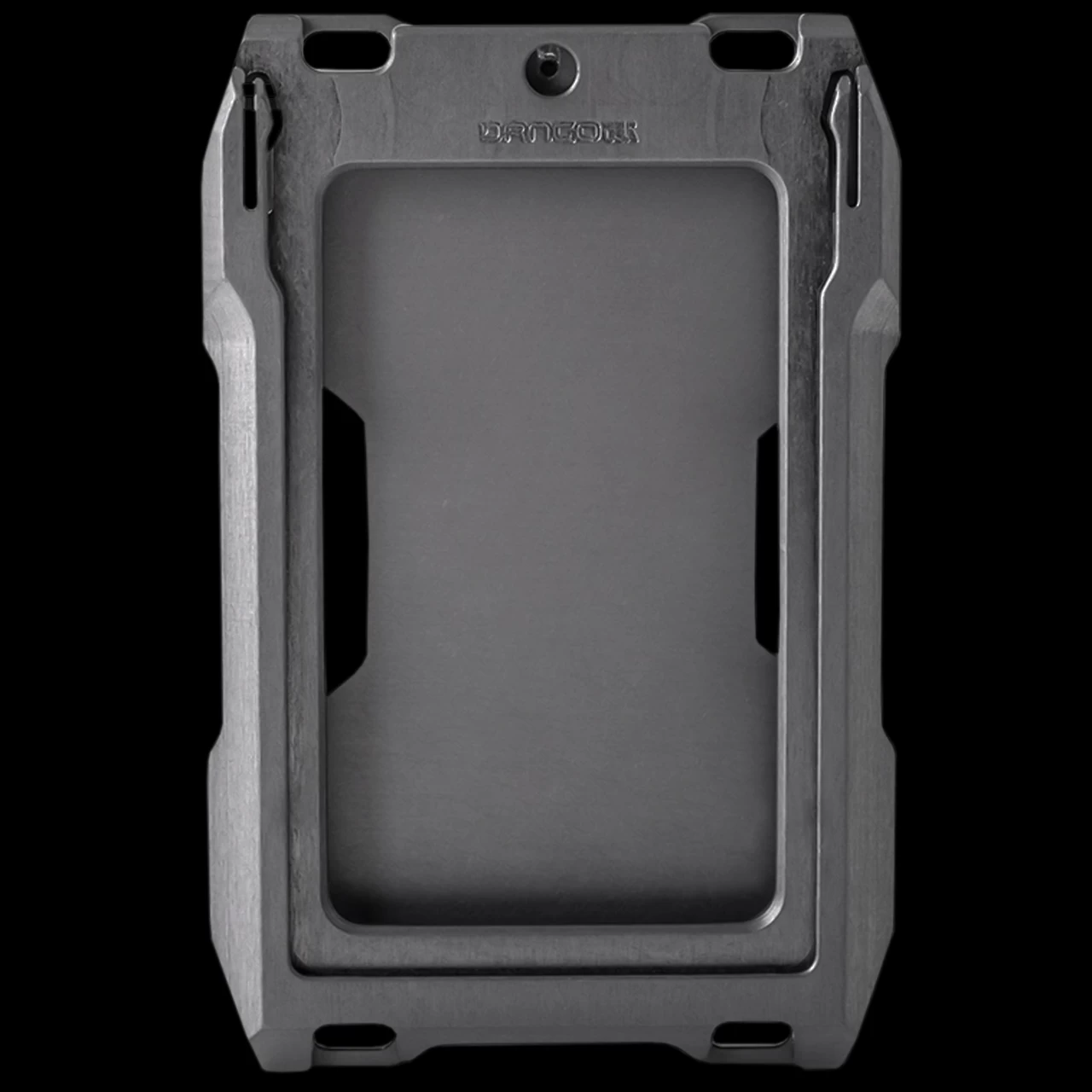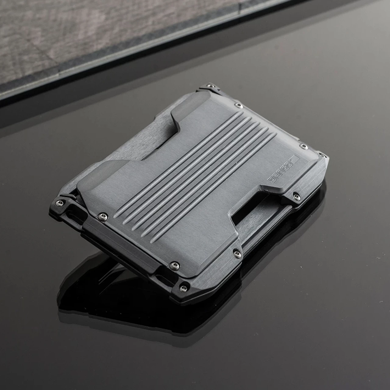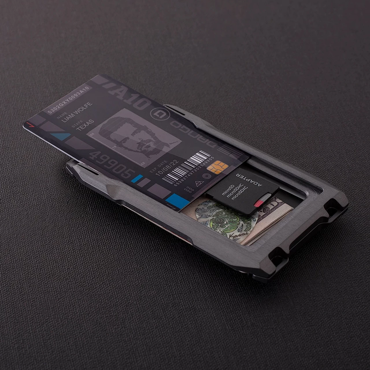 The A10 wallet chassis is made of machined 6061 aerospace grade aluminium and anodized to perfection. The A10 is equipped with Dango’s popular and unique patent pending quick release rail mechanism on both sides of the wallet that allows easy access to cards while keeping them securely in place. On one side of the chassis is a horizontal cavity holding up to 4 cards that is protected by a removable aluminium RFID plate. On the other side is a single card, vertical oriented cavity meant for displaying identification, badges and any cards that needs scanning; perfect for accessing secured buildings and boarding public transportation.