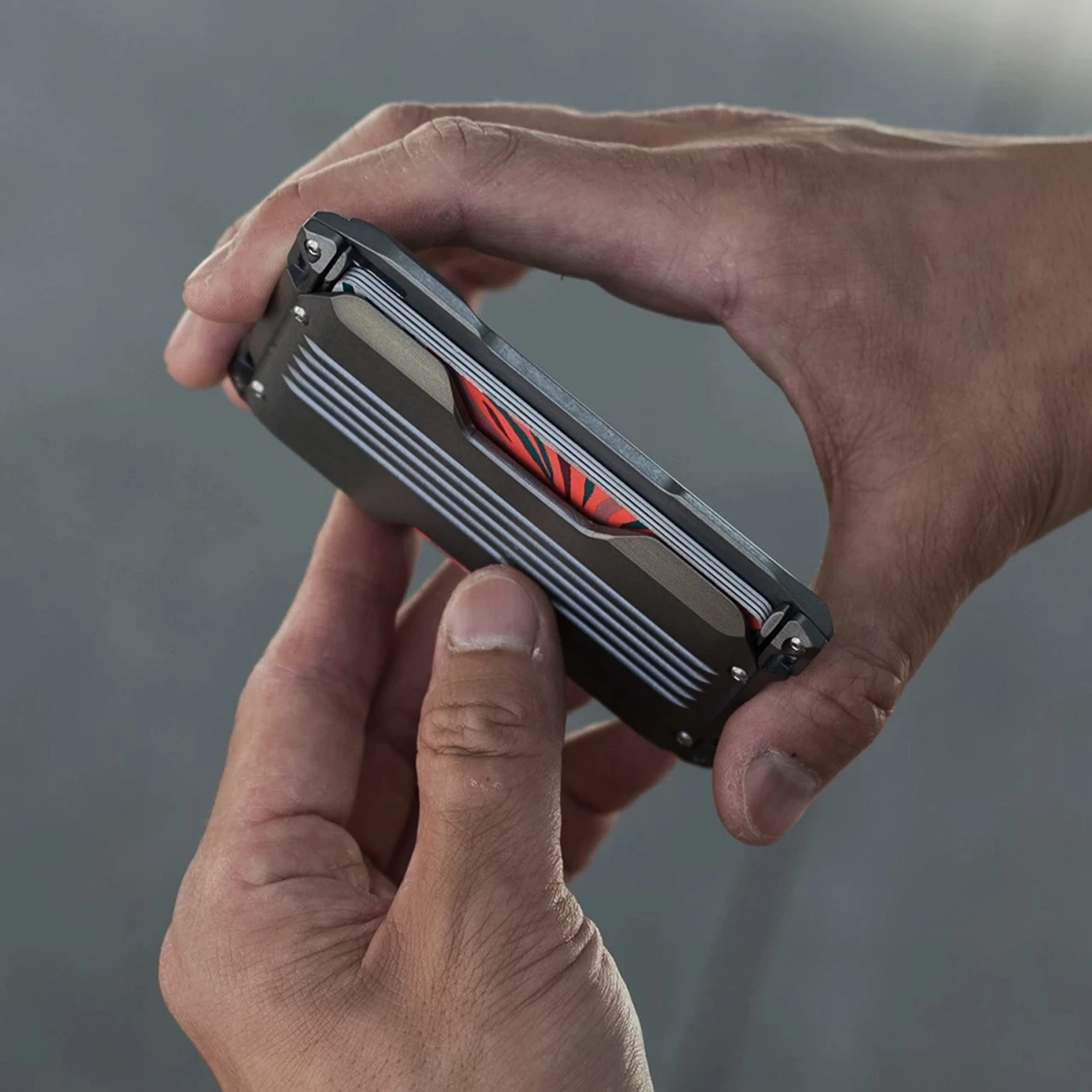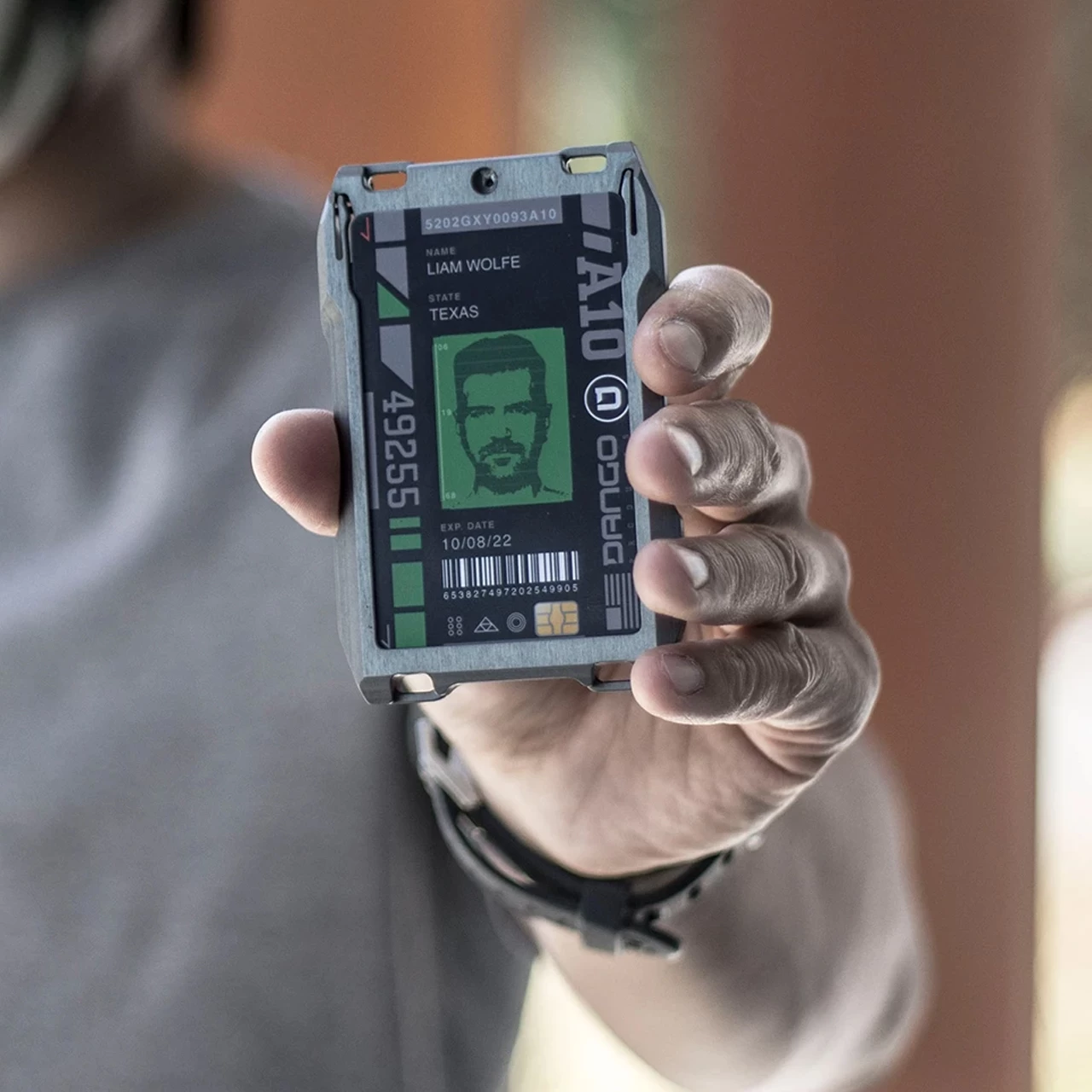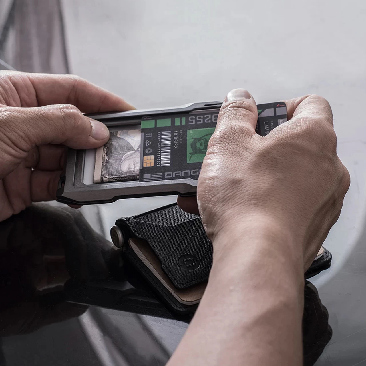 The A10 wallet chassis is made of machined 6061 aerospace grade aluminium and anodized to perfection. The A10 is equipped with Dango’s popular and unique patent pending quick release rail mechanism on both sides of the wallet that allows easy access to cards while keeping them securely in place. On one side of the chassis is a horizontal cavity holding up to 4 cards that is protected by a removable aluminium RFID plate. On the other side is a single card, vertical oriented cavity meant for displaying identification, badges and any cards that needs scanning; perfect for accessing secured buildings and boarding public transportation.
