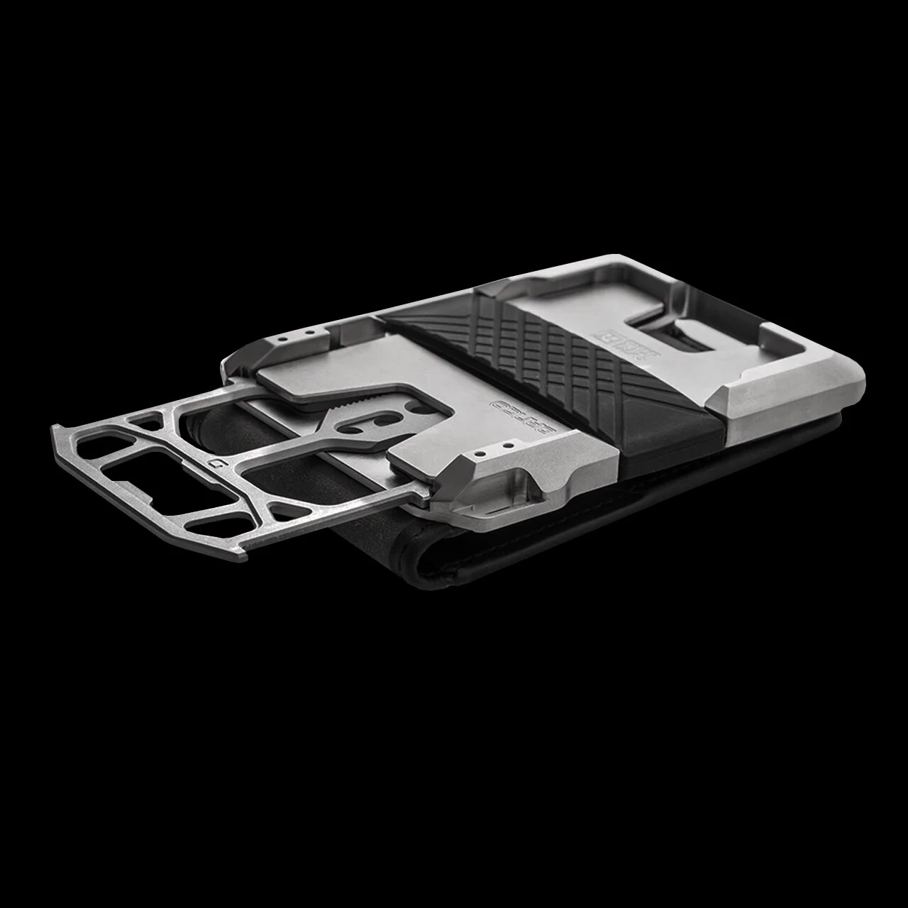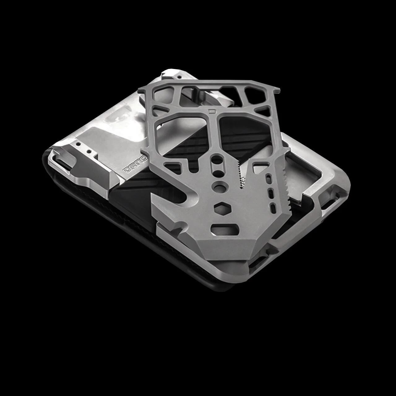 The M1 Titanium Maverick Tactical Wallet comes with the 10-function Dango MT04 multi-tool which slides into the cavity where the cards sit. When engaged, the multi-tool can nest securely into the safety locks built into the wallet chassis- allowing for easy sawing, cutting and protection. Common tools are built in: bottle opener, paracord cutter, rope tensioner, nail pryer, a serrated/sharpened edge and even a belt cutter and oxygen wrench which is perfect for survivalists. Dango thought of everything and think you will be pleased with all of the functions built into a compact package.