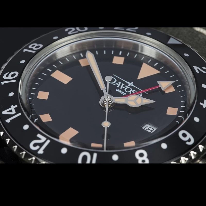 The Davosa Vintage Diver Quartz is a stylish everyday watch for all retro style lovers and, with its diameter of 39 mm, perfect for every wrist. The Swiss quality movement Ronda 505/24h also allows the display of a second time zone which is highlighted by a red hand.