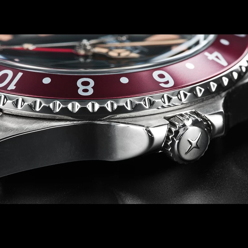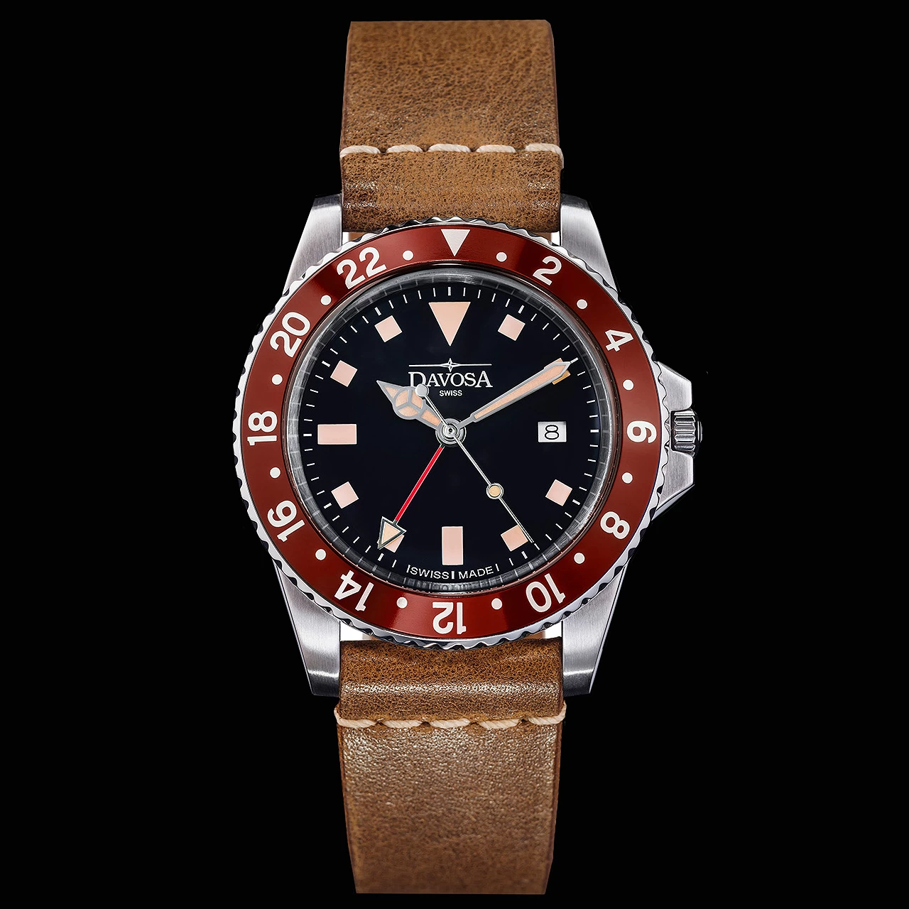 The Swiss quality movement Ronda 505/24h also allows the display of a second time zone which is highlighted by a red hand.