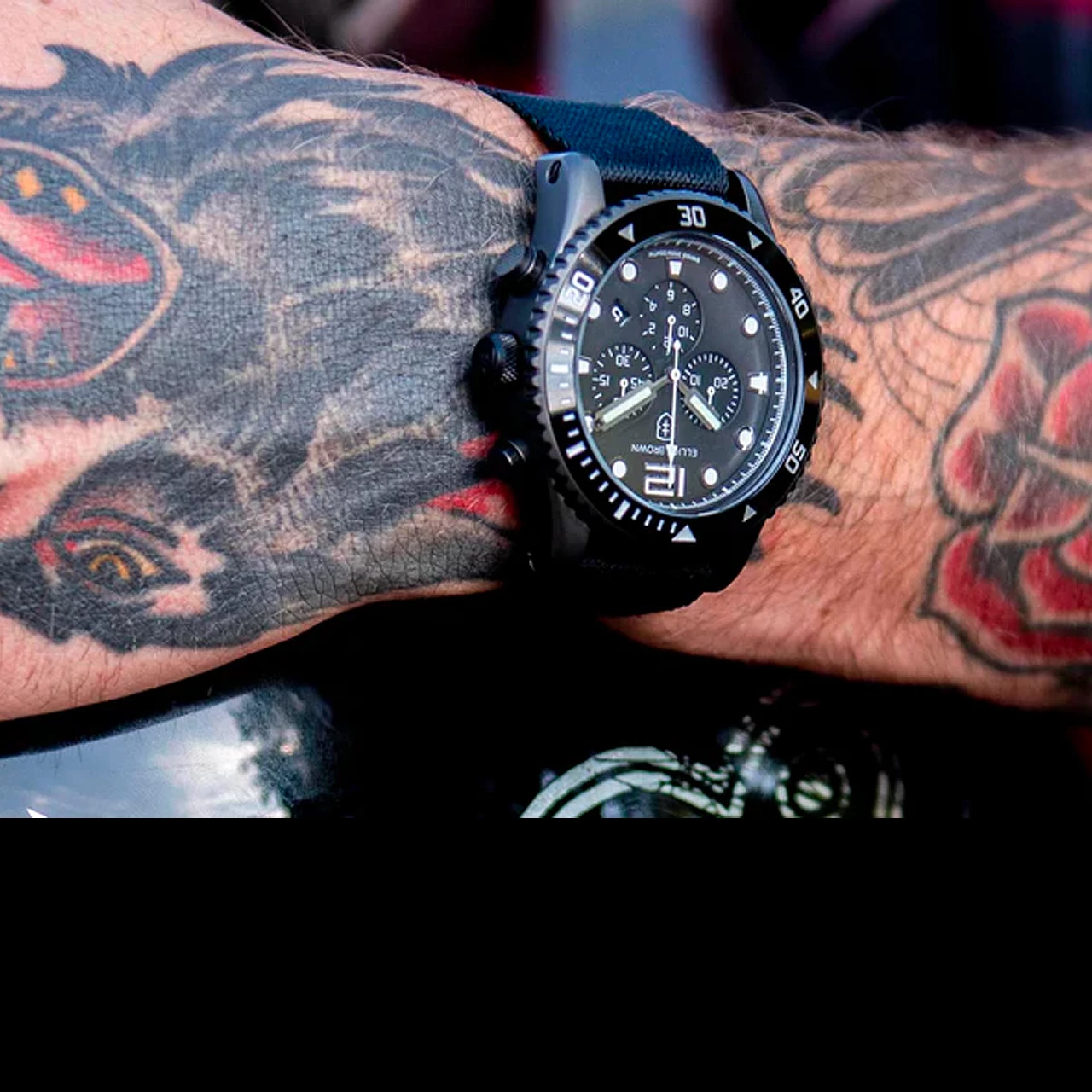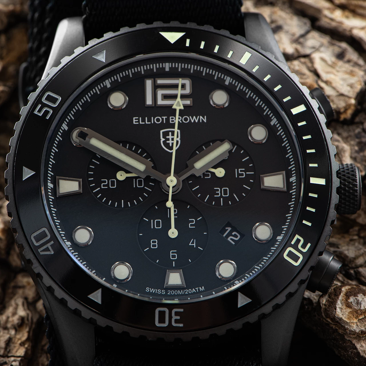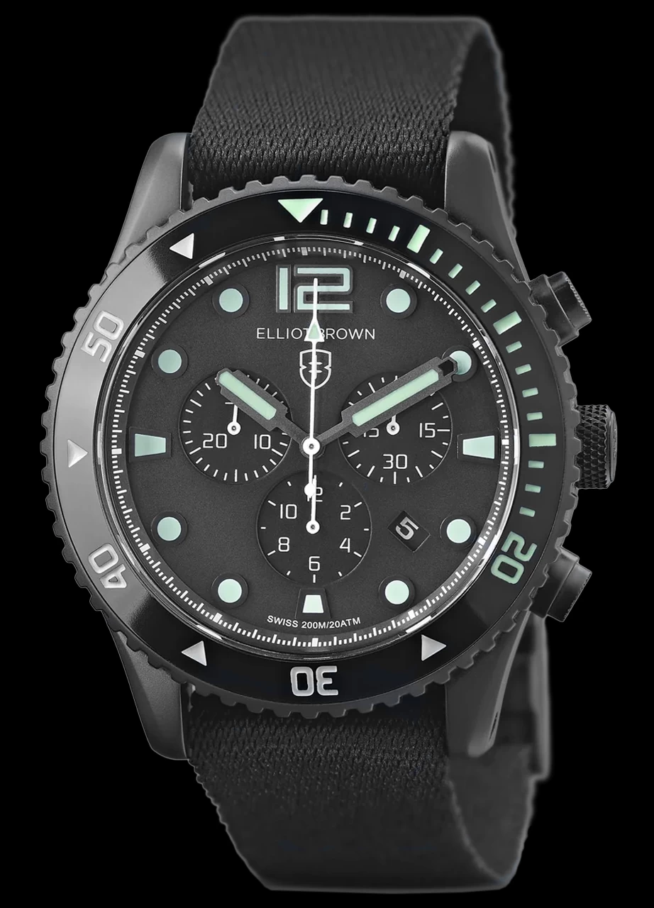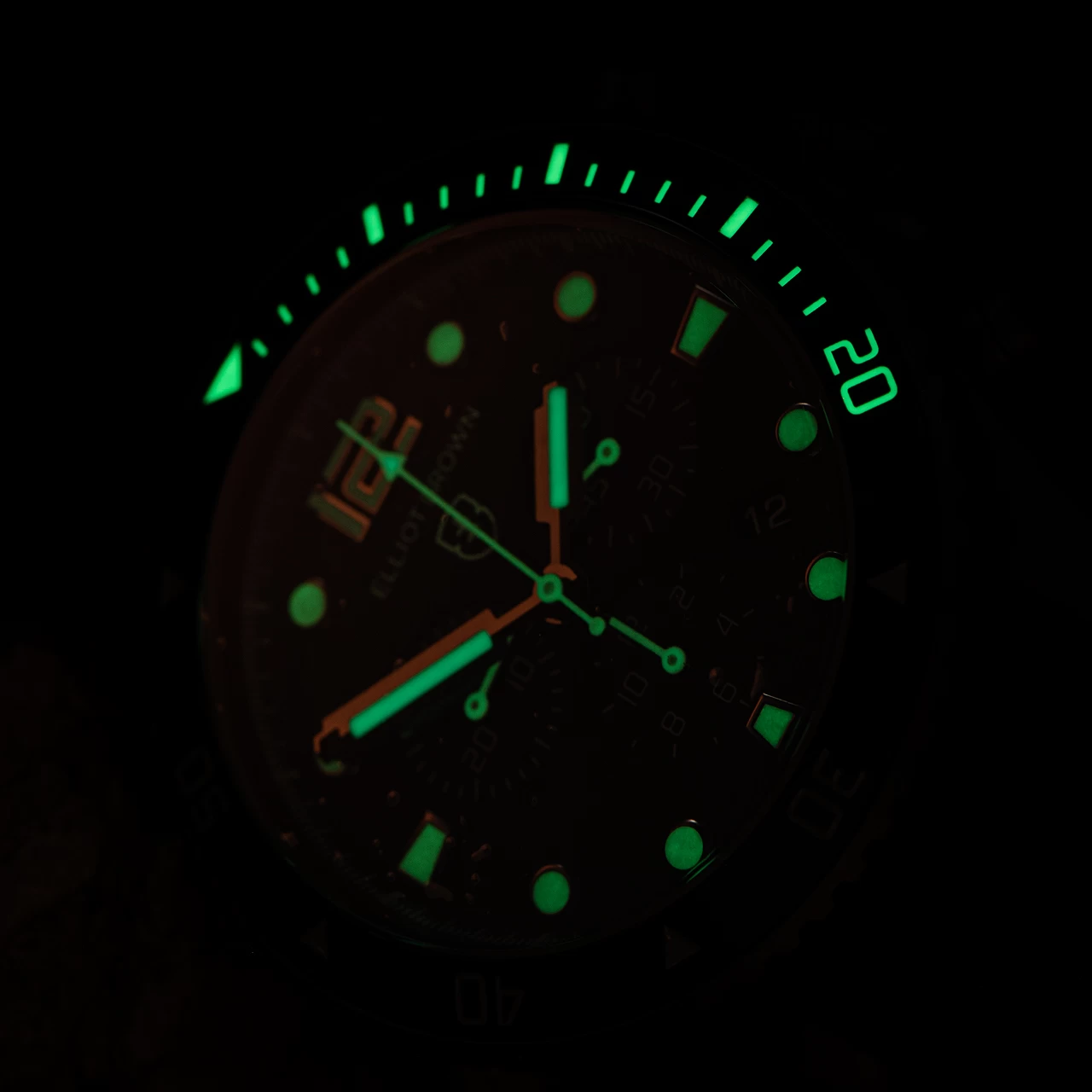 The Elliot Brown Bloxworth Chrono 929-002-N15A is a stealthy watch whose subtle detail grows and grows. X1 C3 SuperLuminova® is a real highlight when the light gets low. One of Elliot Brown’s most indestructible watches.