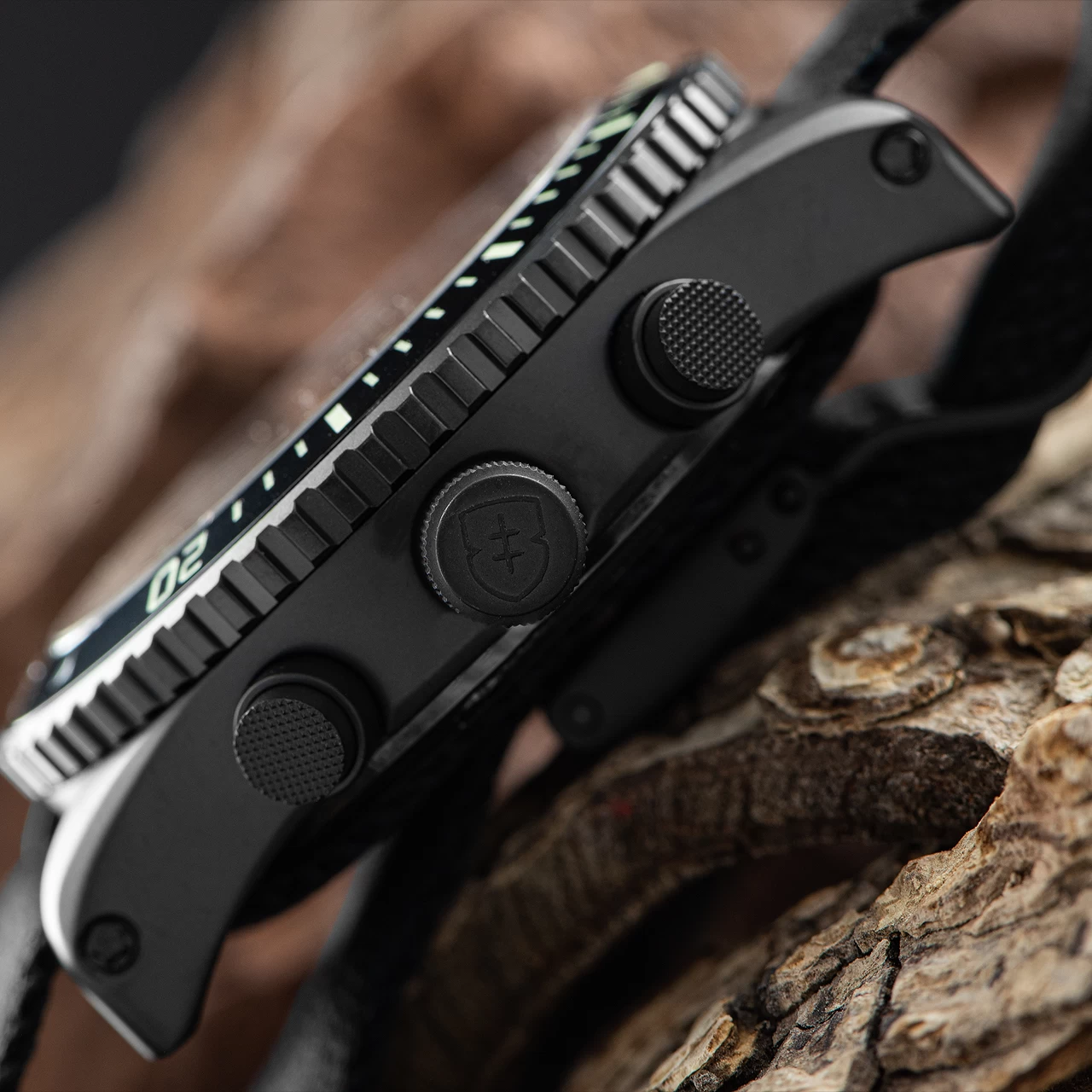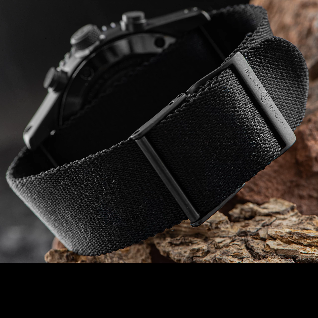 This stealthiest Bloxworth is equally at home on duty or paired with smarter outfits. It’s technical matt dark gunmetal case is the epitome of Elliot Brown’s considered everyday useability, set-off perfectly by the gloss black bezel insert with pale green SuperLuminova markings for great night time performance.