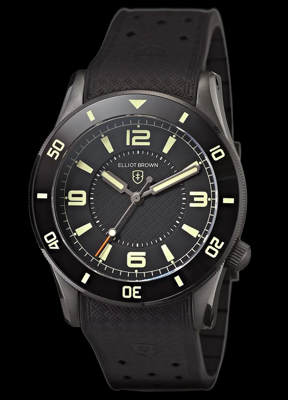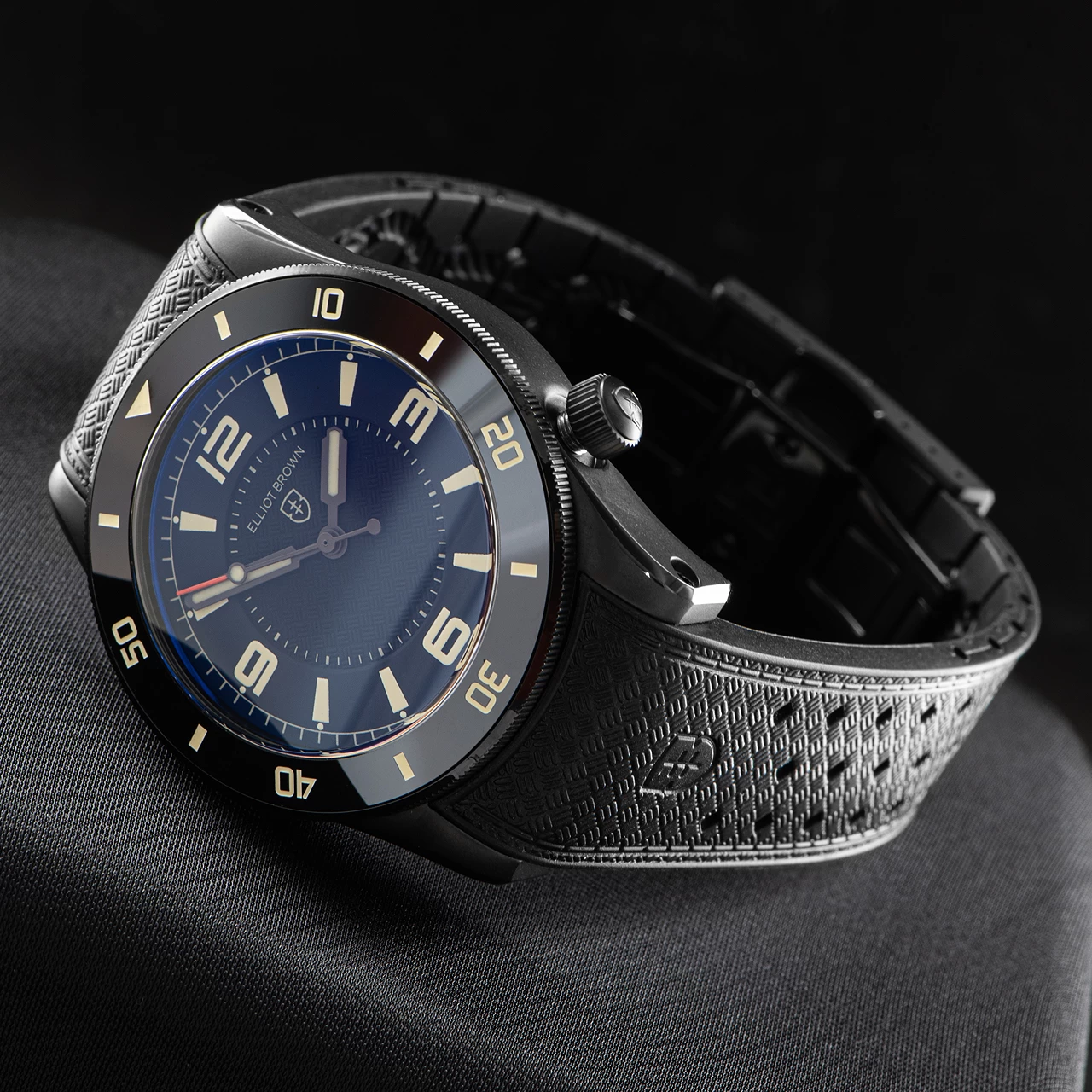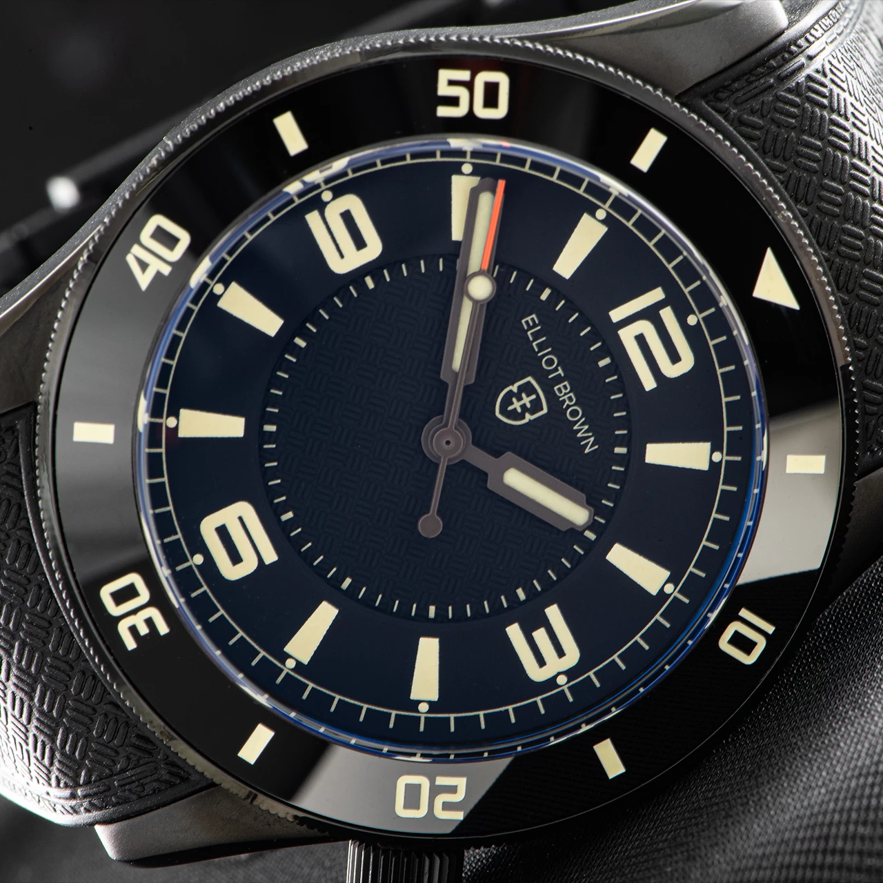 The Elliot Brown Bloxworth Heritage Diver 929-102-R51 features a case whose vapour blasted dark gunmetal finish is so finely executed it almost looks ceramic. The precision of the case finishing is so beautifully highlighted with highly detailed ‘pops’ of gloss that lift it to another level. The overall effect is a watch that looks ready for duty but is so easy on the eye and on the wrist.