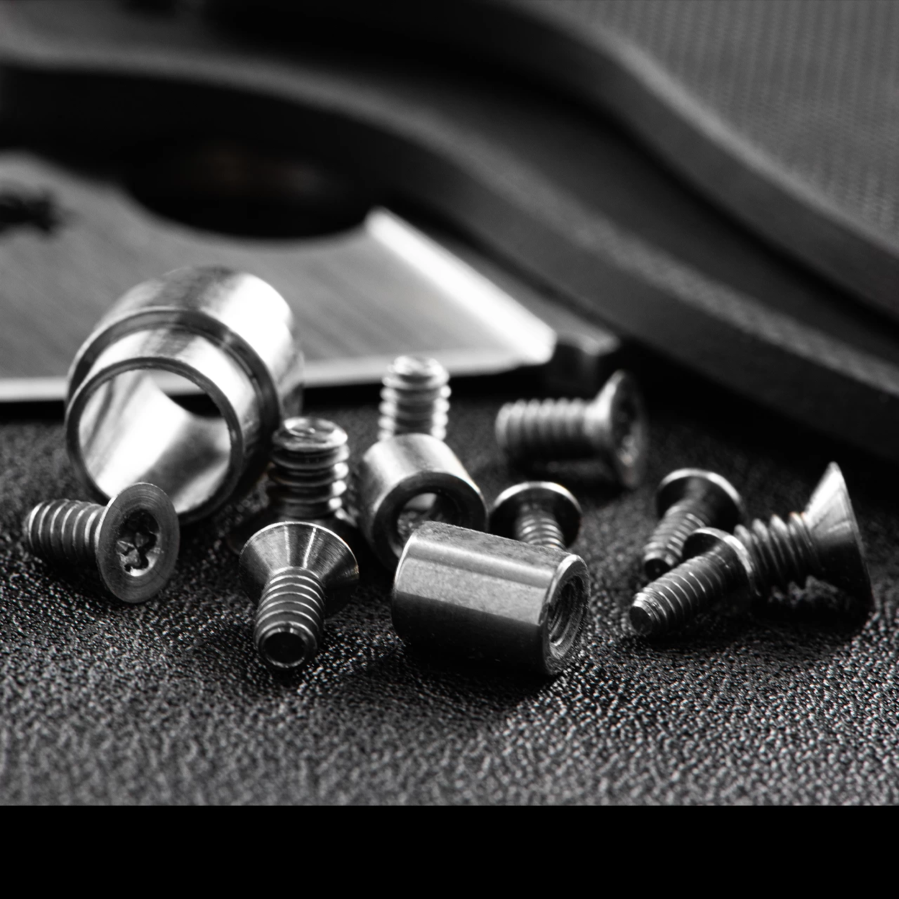 The Flytanium PM2 Titanium Hardware Kit is a set of screws and spacers machined from titanium that are designed as a straight repleacement for the screws and spacers in your existing knife. Simply unscrew your existing plain steel screws, and replace them with these high-end replacements.