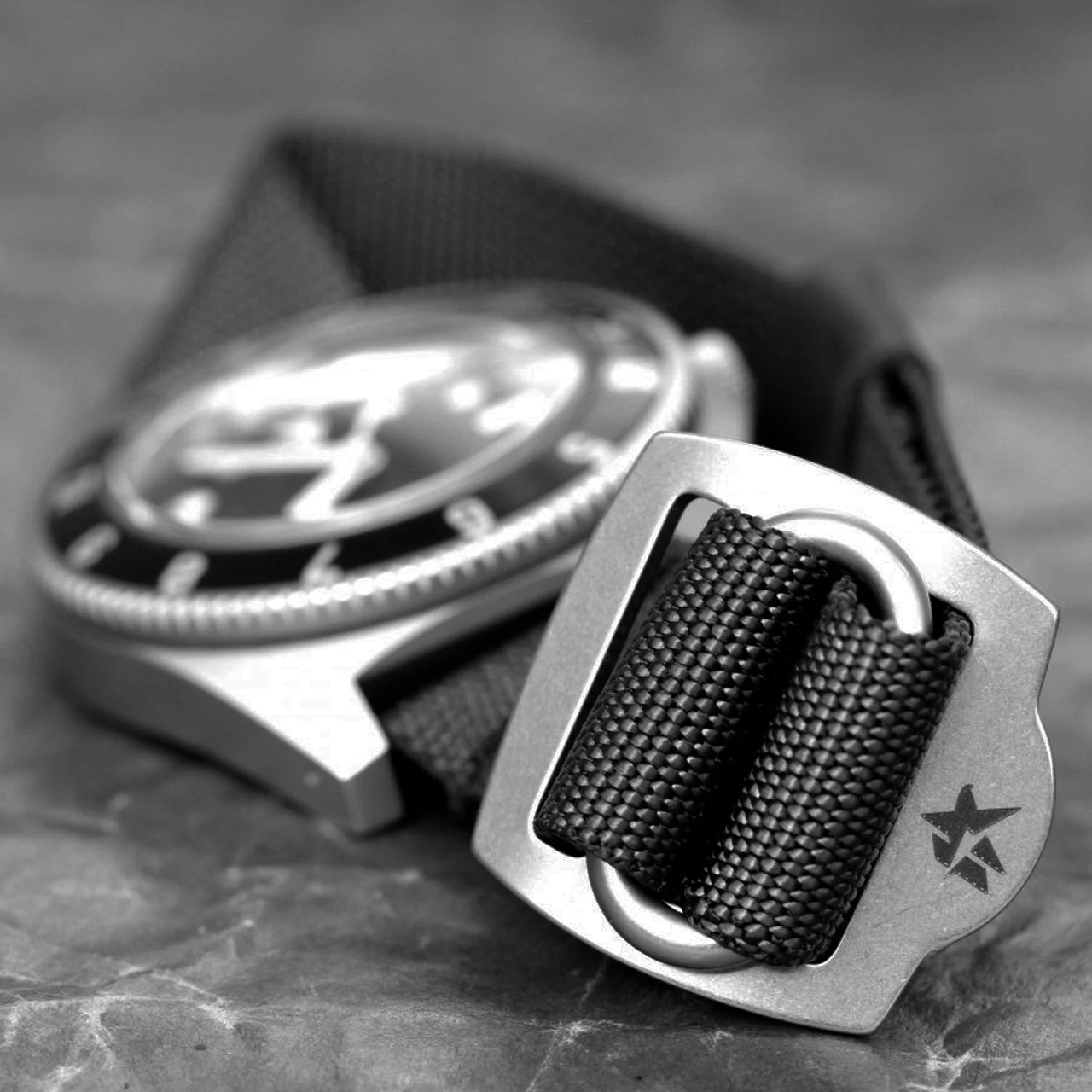 The Hawkrigger Huey O-Rig is a simple cinch down one pass strap. The O-Rig, in the rigger tradition, repurposes the standard ZULU o-ring in synergy with the bespoke buckle frame to create a unique strap set up. Aesthetically it is influenced by the iconic lines of the Bell UH-1 Iroquois (nicknamed “Huey”) utility military helicopter. This strap is a super comfortable, cinch to size, rock solid platform for your tool watch.