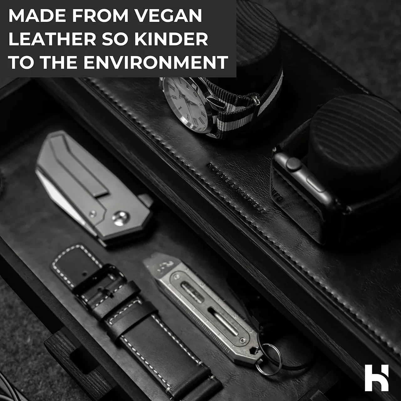 The watch deck padding is made from vegan leather so is kinder to the environment than normal leather. Available in rustic brown and black.