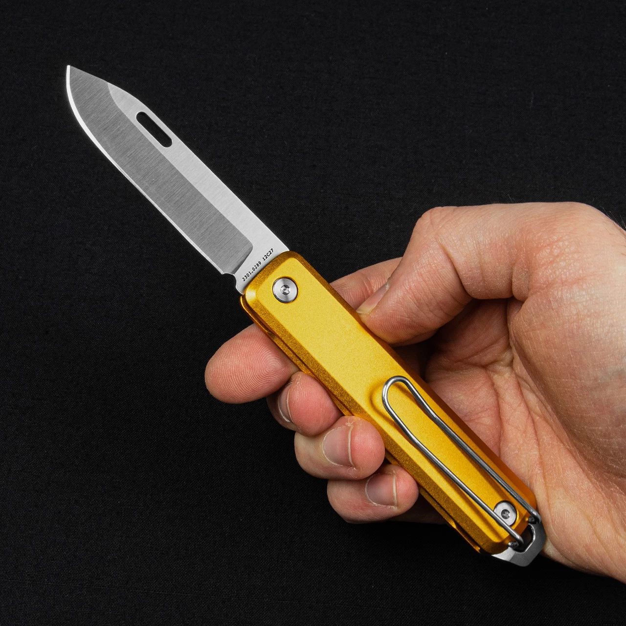 This version of the Ellis Slim has orange aluminium handle scales. It features the same Swedish Sandvik 12C27 steel that is featured on the standard Ellis and Elko, and comes with a deep-carry wire clip as well as the “All-Things” scraper, flat-head screwdriver and pry bar. If you’re looking for truly minimal daily carry look no further than the Ellis Slim.