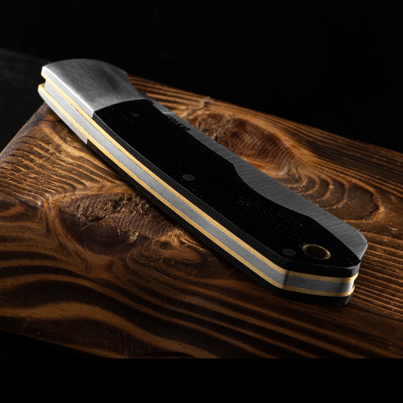 The polished micarta handle helps turn the Parley into a standout showoff piece with plenty of durability. The handle also features steel bolsters with brass liners.