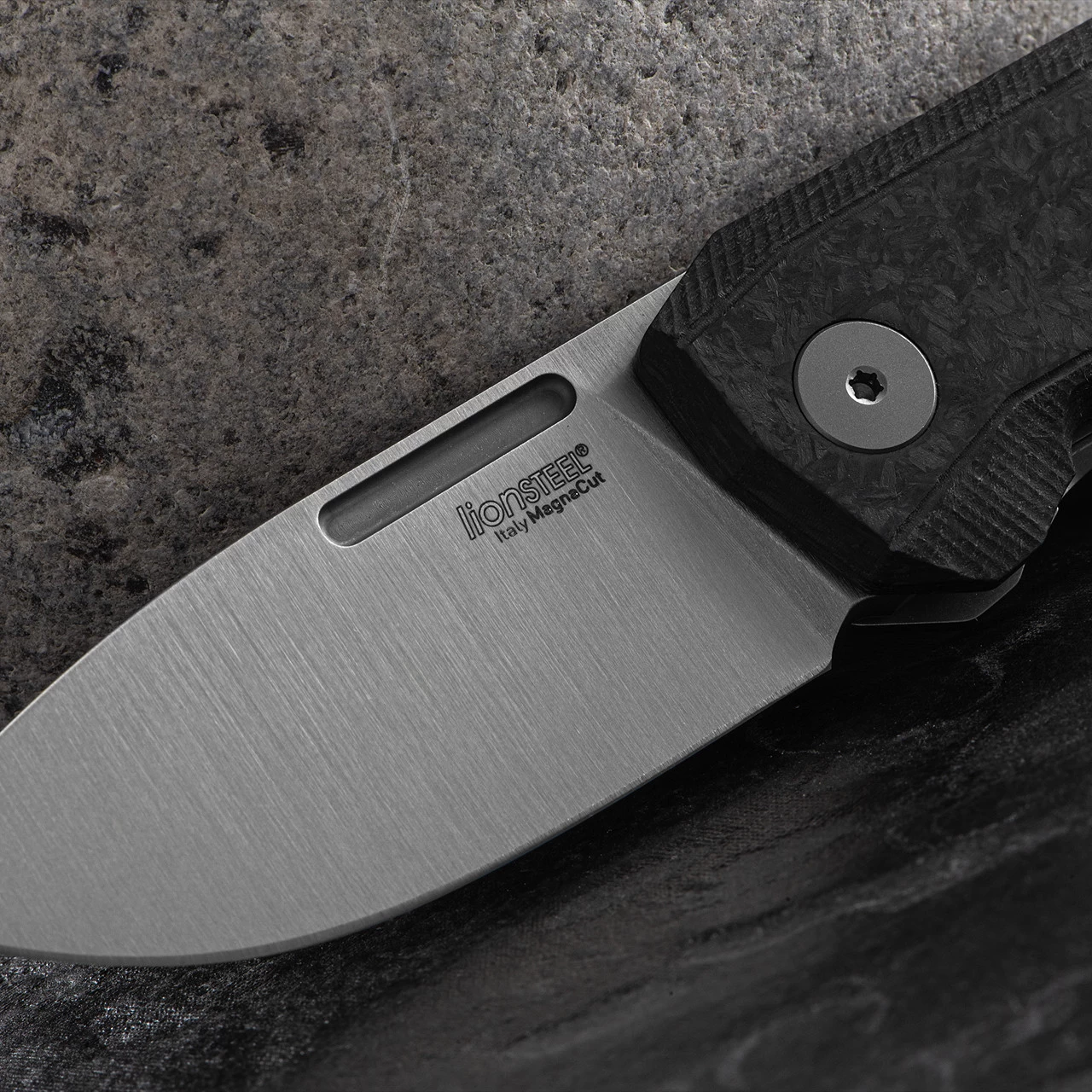 The LionSteel Nano Carbon Fibre features an elegant crushed carbon fibre scale on the non-locking side. The other side of the knife features an finely milled titanium frame lock, securely holding your blade in place.
