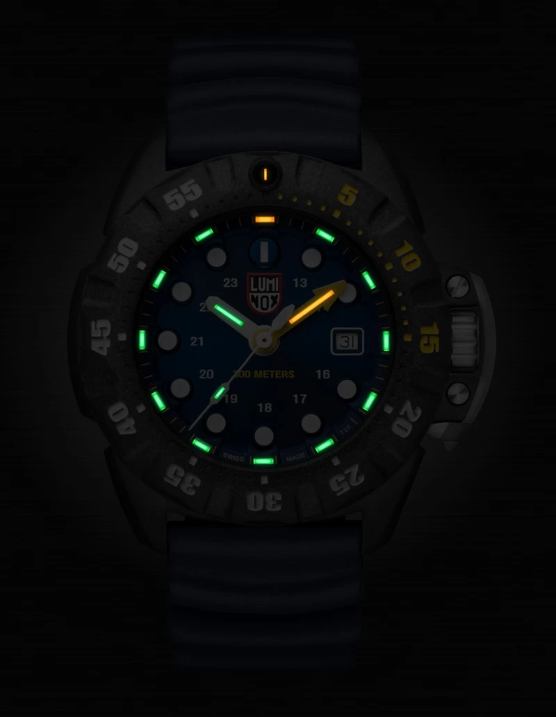 Luminox’s signature double security oversized knurled crown is present within the crown guards at 3 o’clock. On top of the dial there is scratch-resistant, coated and non-reflective sapphire crystal glass.