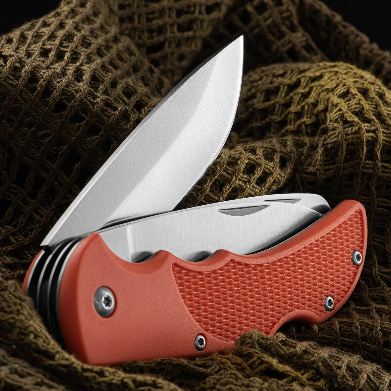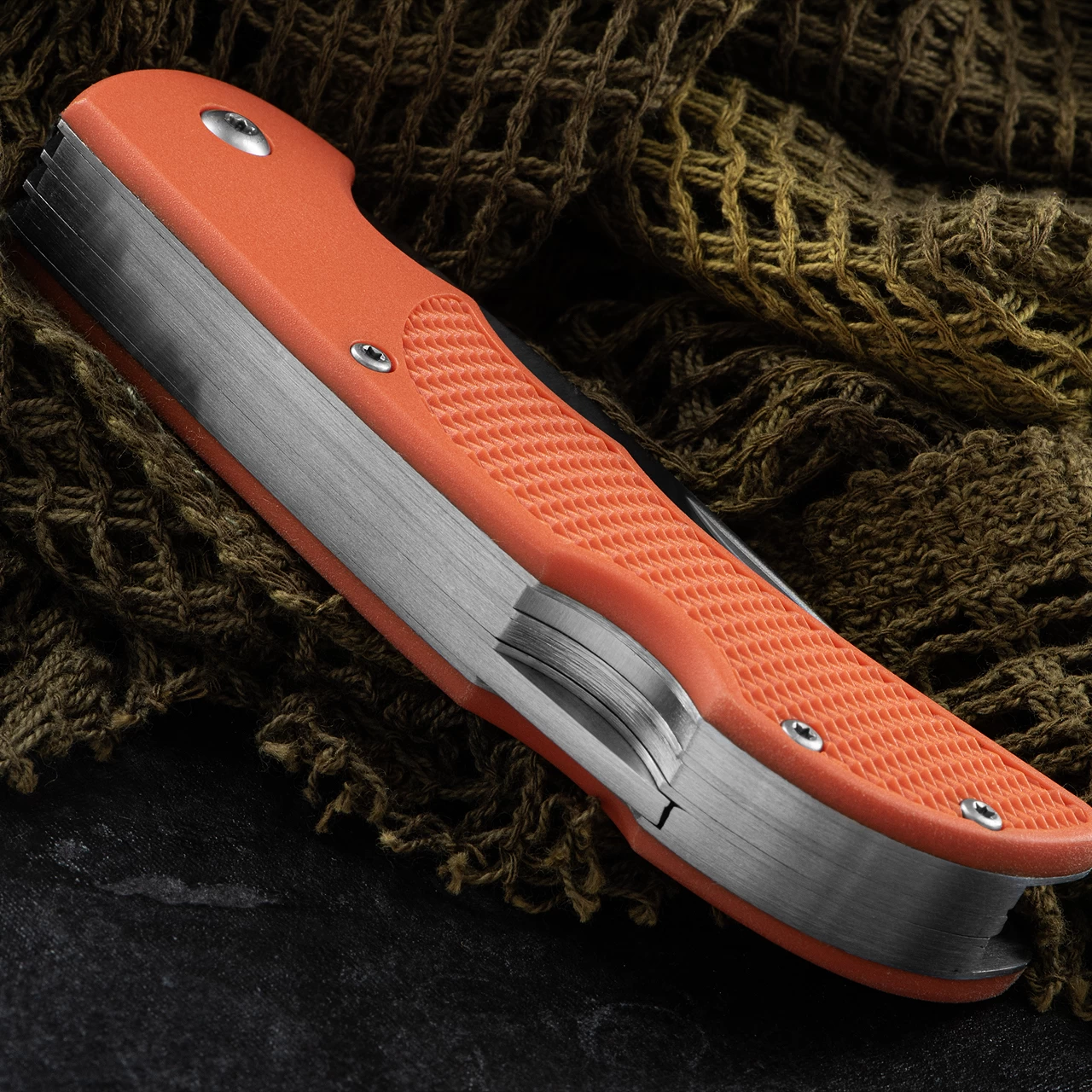 All blades are forged from 440C stainless steel. The handle is made of fibreglass reinforced nylon (FRN) in signal orange with a fish skin texture. This makes for a secure grip in all conditions.