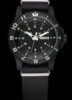 The Marathon 18mm Sterile Stainless Steel Bracelet features a superior floating double screw link system and a locking buckle for extra security. It also has a diver’s extension hidden underneath the clasp. It’s “Sterile”, without government markings.