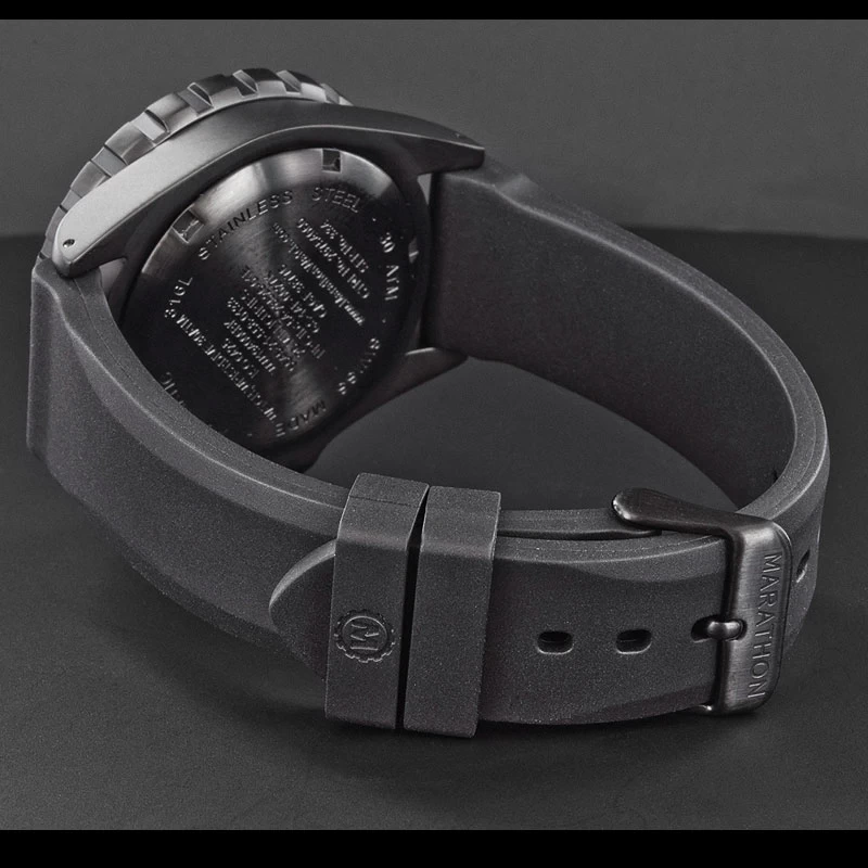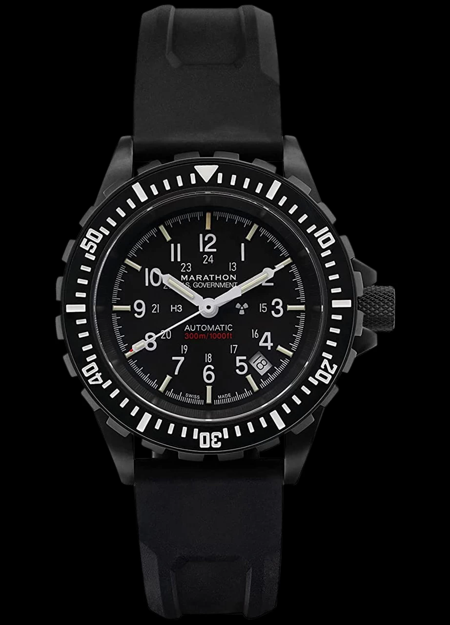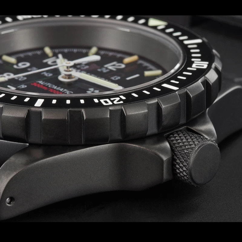 The Diver’s Automatic uses self contained Tritium gas tubes to ensure constant visibility in low light situations. A gas tube is placed on each hour marker, each hand and uses MaraGlo for the 12 hour bezel marker. Tritium tubes are self illuminating gas tubes which contain an isotope of hydrogen, meaning they will not dull down in brightness like normal photo-luminescent paint which requires an external light source to create a glow.
