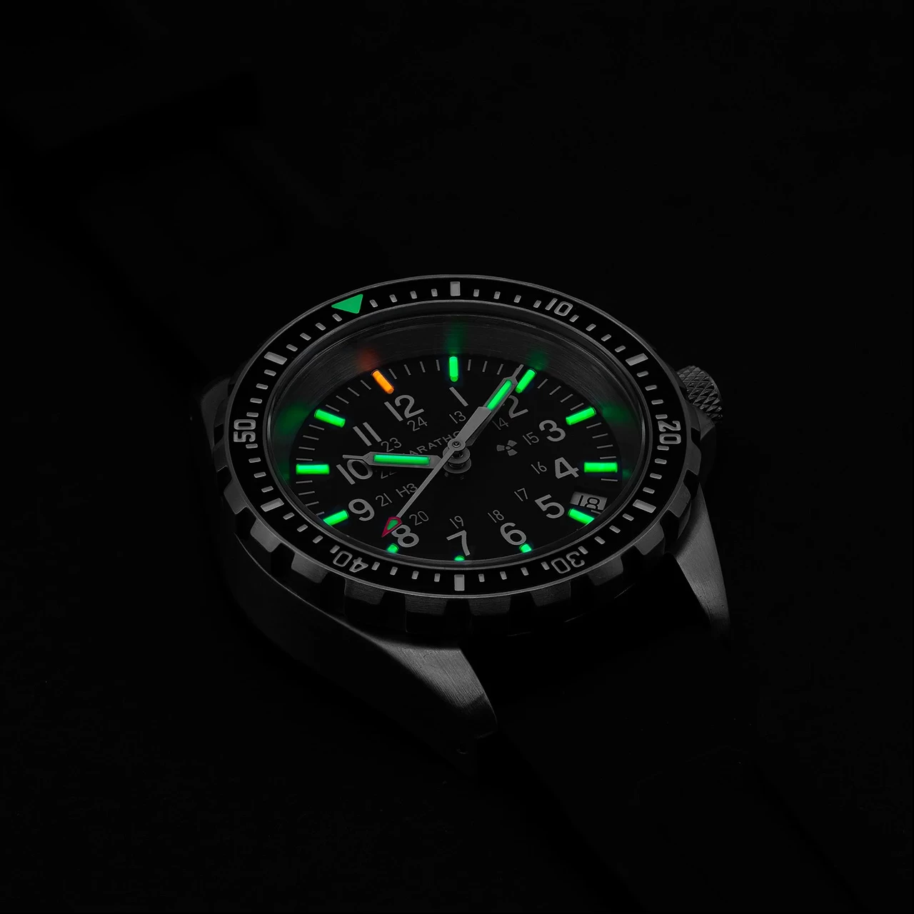 The Diver’s Quartz Medium uses self contained Tritium gas tubes to ensure constant visibility in low light situations, a Tritium gas tube is placed on each hour marker as well as the hour and minute hands. Tritium tubes are self illuminating gas tubes which contain an isotope of hydrogen that does not dull in brightness.
