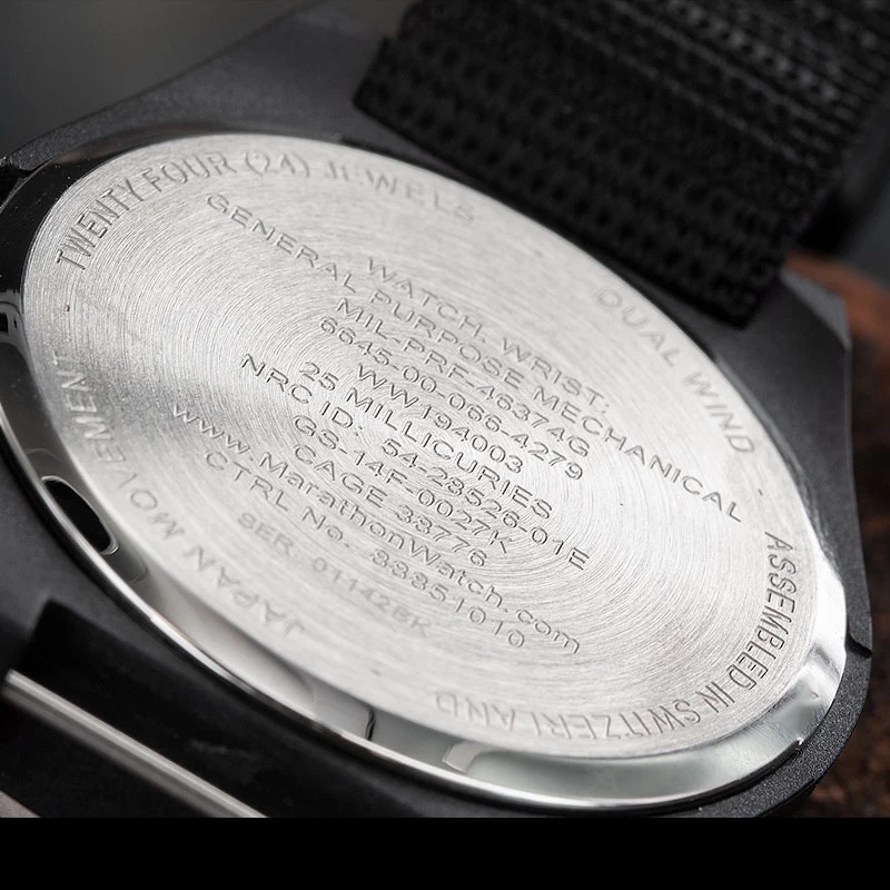 The Marathon GPM uses a Japanese made 24 Jewel NH35 self-winding mechanical movement and can be wound both by manually winding the crown or by use of the automatic self-winding rotor (transferred energy caused by the movement of the wrist). With the new watch winding system, the user will notice that there is a mechanical noise and the rotor can be felt oscillating; reassuring the user that the automatic winding system is performing as intended. Once fully wound the GPM will run for approximately 41 hours without the need to be wound again, or can be worn to wind using the automatic self-winding rotor.