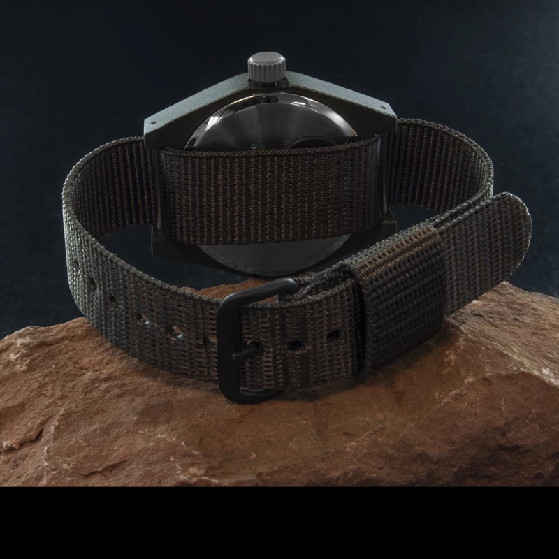 The General Purpose Quartz is made from a highly durable fibershell case that is water resistant to 3 atmospheres (30 meters – 100 feet) and will not yield to the elements. The fibershell case of the General Purpose Quartz also has a passive matte finish. This matte finish aids in protecting infantry positions as this finish does not provide a reflective surface which would occur on a normal metal case. Fibershell is also an extremely lightweight material, an important factor on the battlefield where every ounce counts.