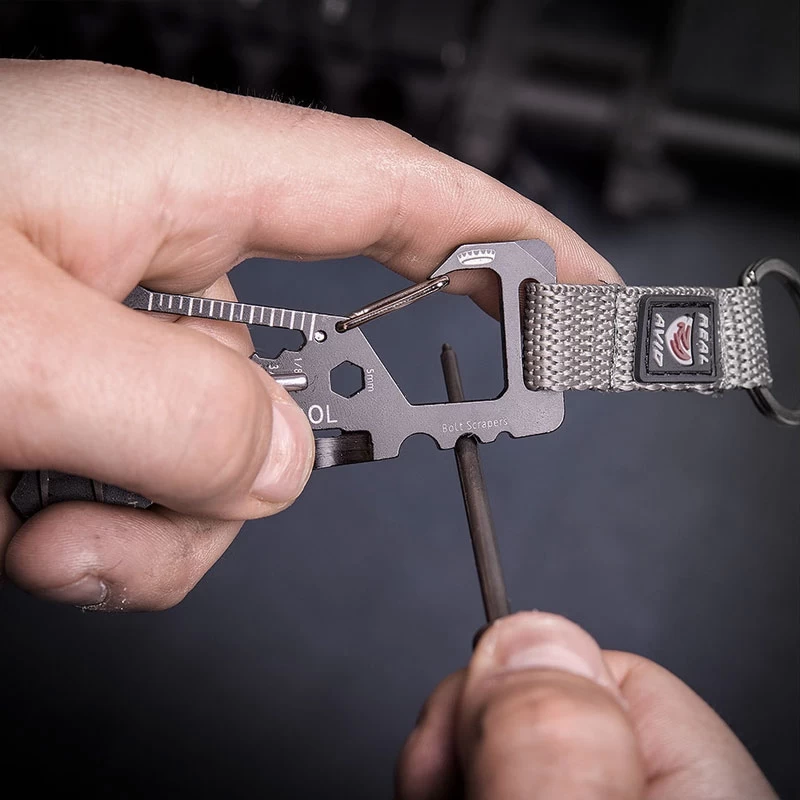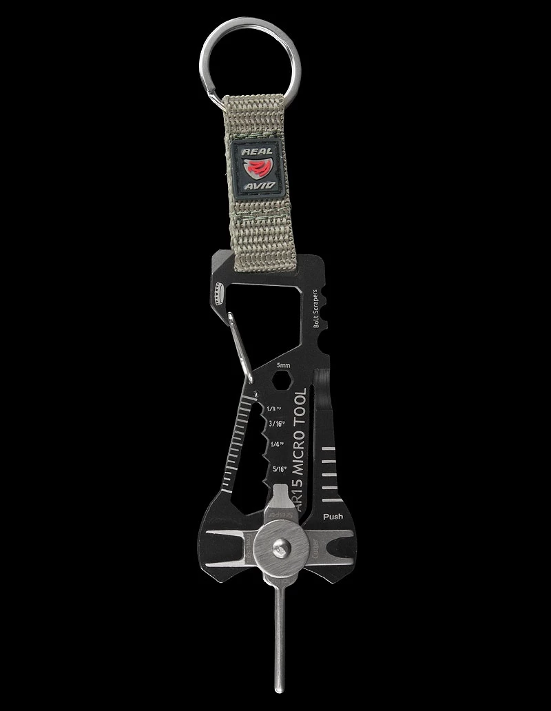In addition to its AR15 specific tools, the AR15 Micro Tool is loaded with convenient everyday functionality: bottle opener, wrenches (1/8” through 3/8”), 1” ruler, flathead screwdriver, cutter, 5MM bit driver, a carabiner, and a key ring with strap.