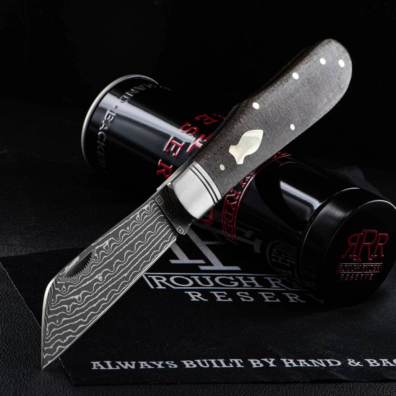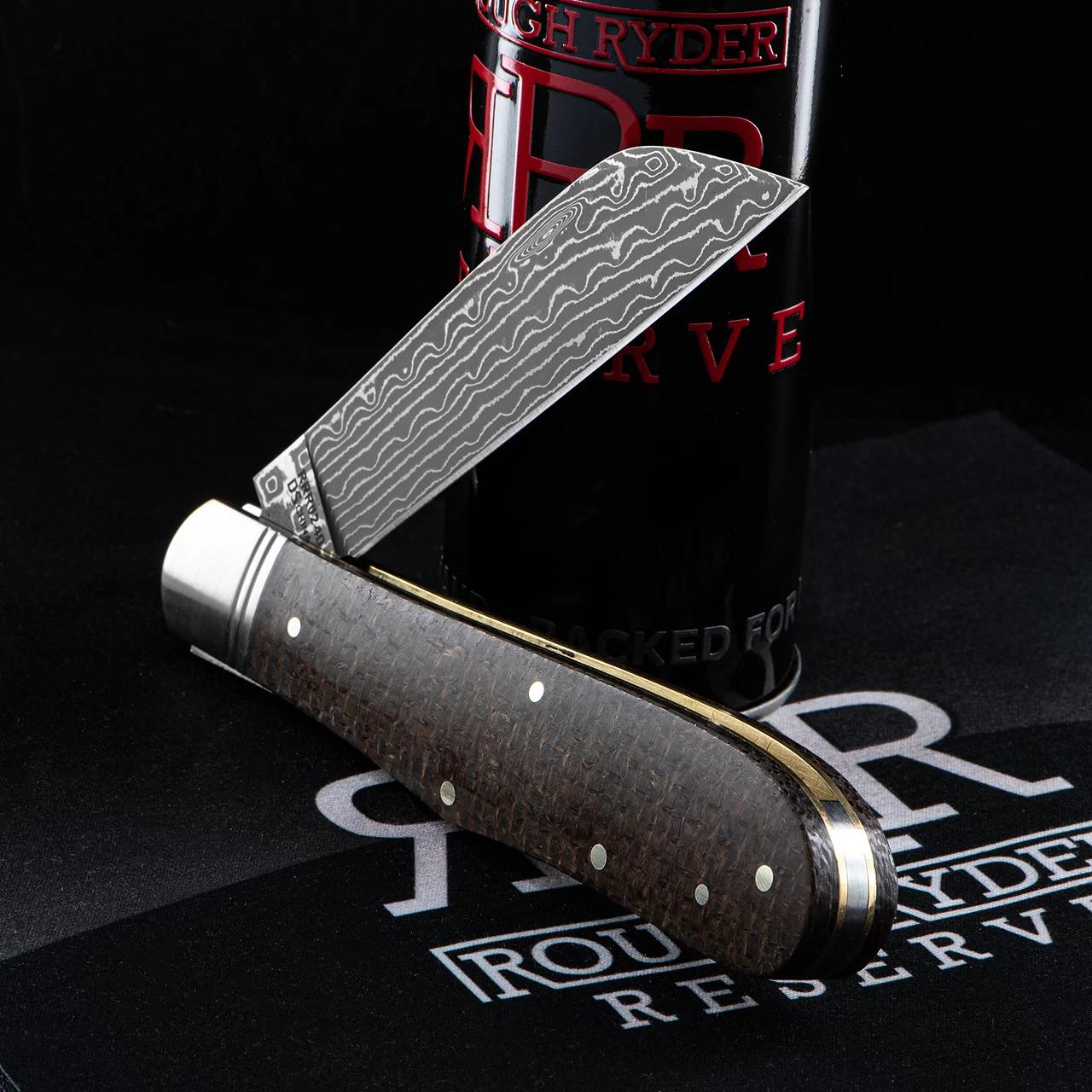 The Rough Ryder Reserve Humpback Jack Damascus Folding Knife features a 8.9cm (3.5″) Damascus steel, Sheepsfoot blade with a match strike pull and a satin finish. The handles are burlap Micarta with brass pins, brass liners, and a brass bomb-shaped shield. It is a very handsome folder, generous in size and endlessly practical in any setting. Includes a Rough Ryder Reserve microfiber cleaning cloth and storage tin.