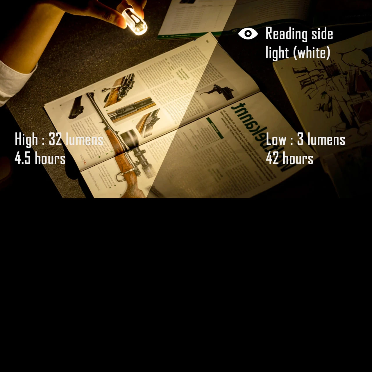 - Neutral white (4000K-4500K CCT) side reading light, 2 brightness levels