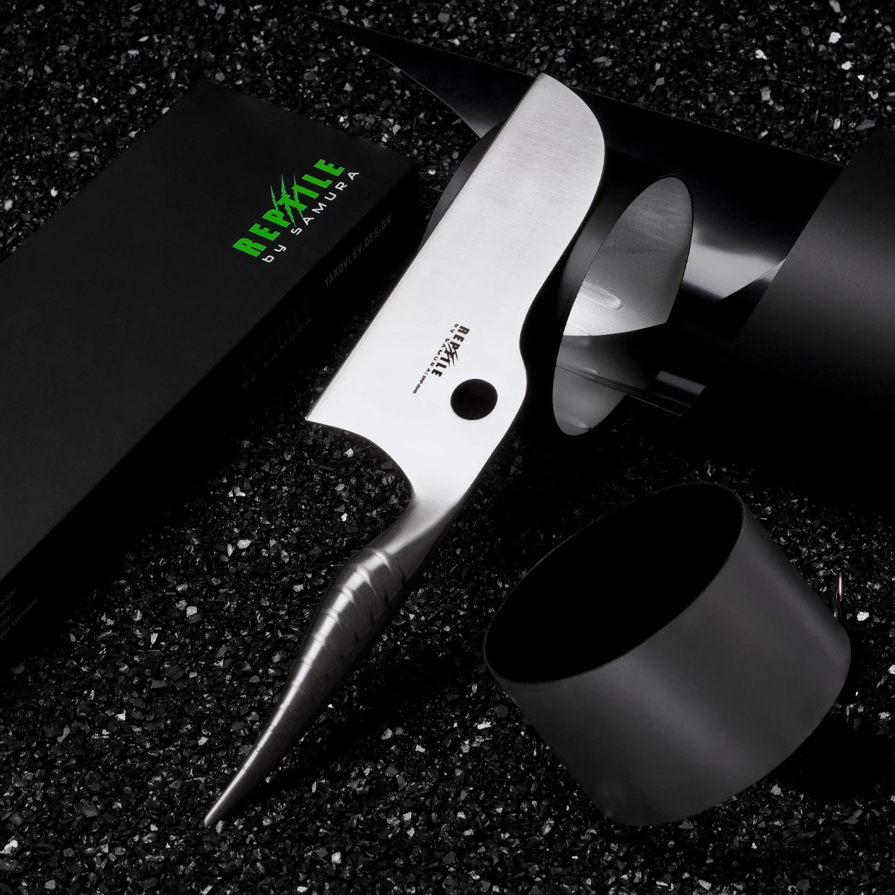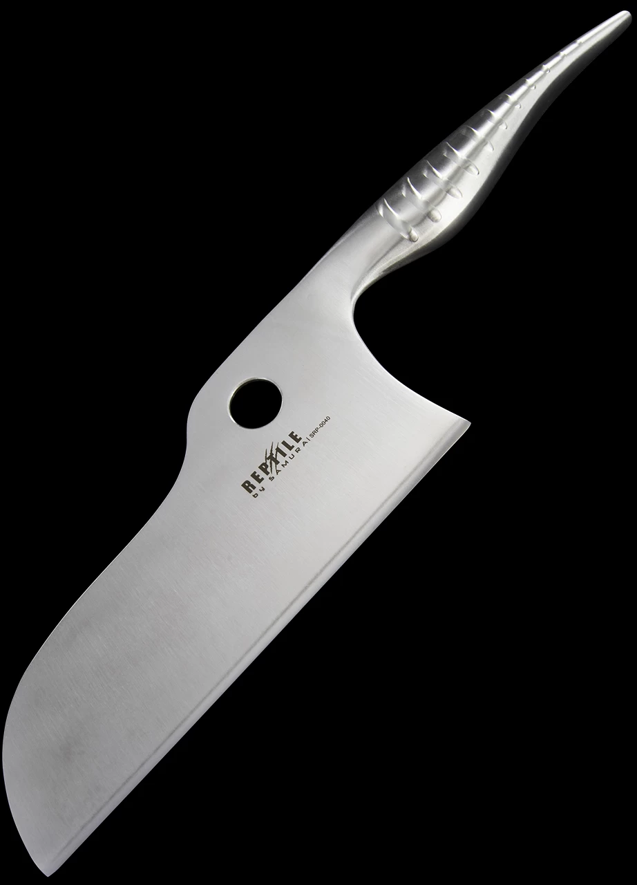 The handle is AUS10 stainless too in an attractive “Reptile” style which will grace any kitchen both professional or domestic or any palette both meat eater or vegan.