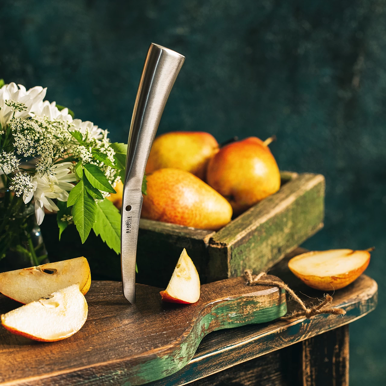 It is designed for peeling and slicing small vegetables and fruits, and its short narrow blade is able to cope splendidly well with this task. With a very light (only 50 grams), compact and ergonomic non-slip oval handle, the vegetable knife is maximally adapted even for quite a lengthy manipulation.
