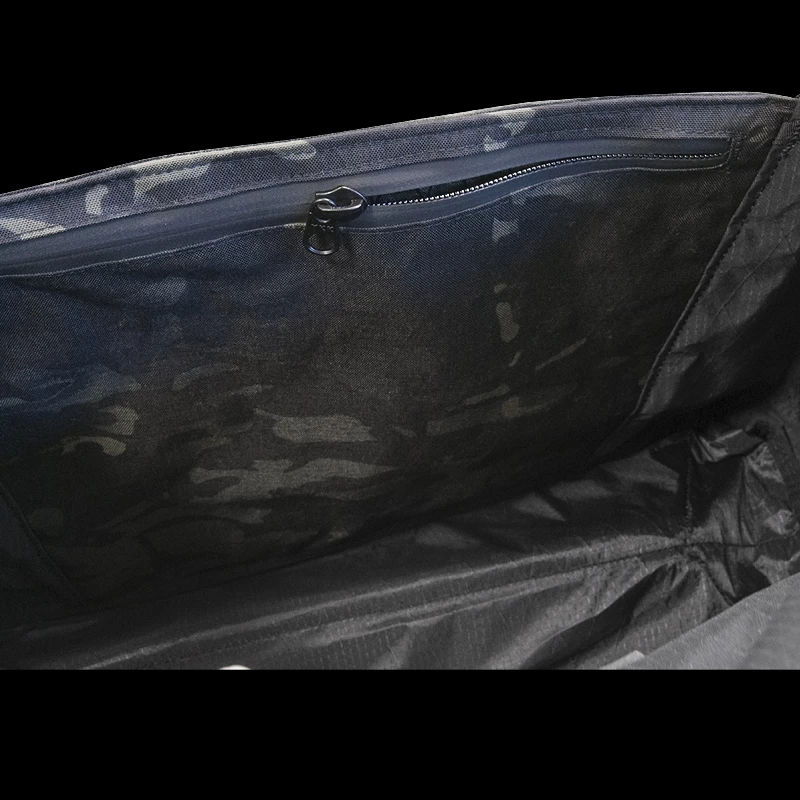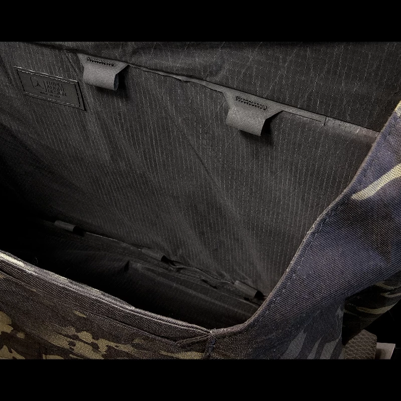 Featuring two Helix attachment points, the drop pocket is compatible with our Admin Panel 1 and forthcoming accessories. A centered welt pocket conceals 3 rows of 1” webbing, compatible with small accessories such as bike lights, folding knives, or our S1 and S2 sheaths. The padded, tubular nylon carry handle lies flat when not in use.