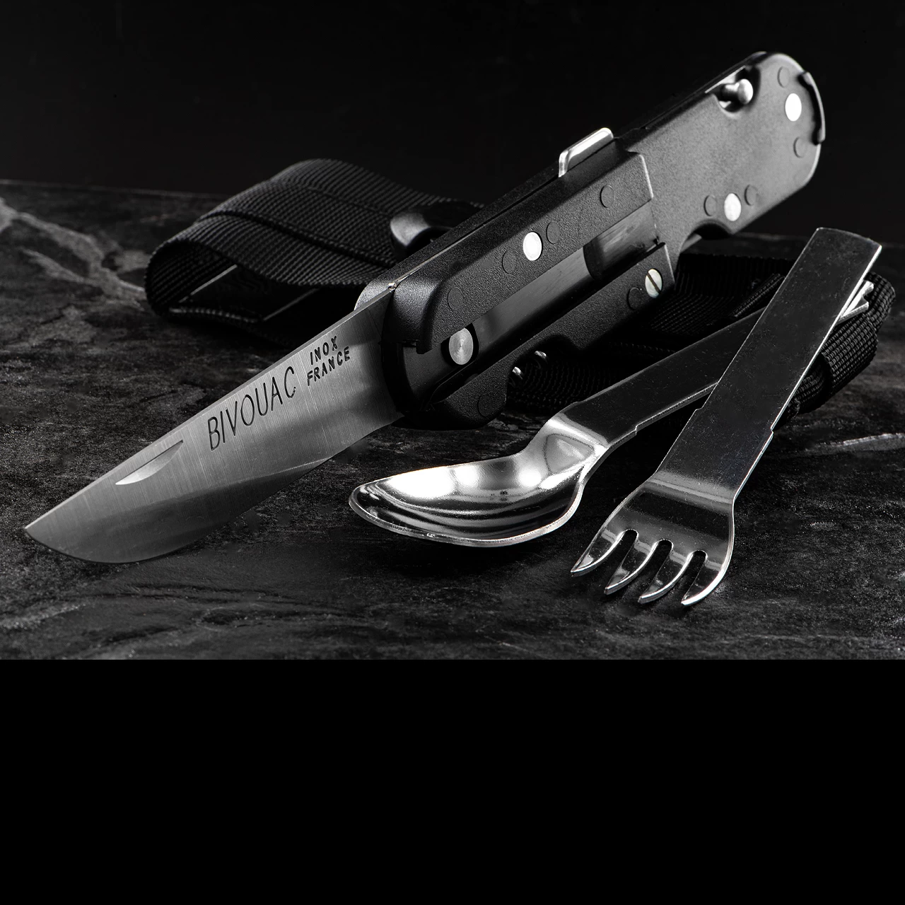 Practical and compact, the TB Outdoor Bivouac is made in Thiers by the French cutler Tarrerias-Bonjean. It is the essential ally for all your camping activities, its tempered stainless steel, locking blade is effective at the table as well as for many other applications and the fork and spoon make for handy eating tools. It also includes a can opener and corkscrew. Its ergonomic handle is made from light and shock-resistant ABS plastic and offers an easy and comfortable grip.