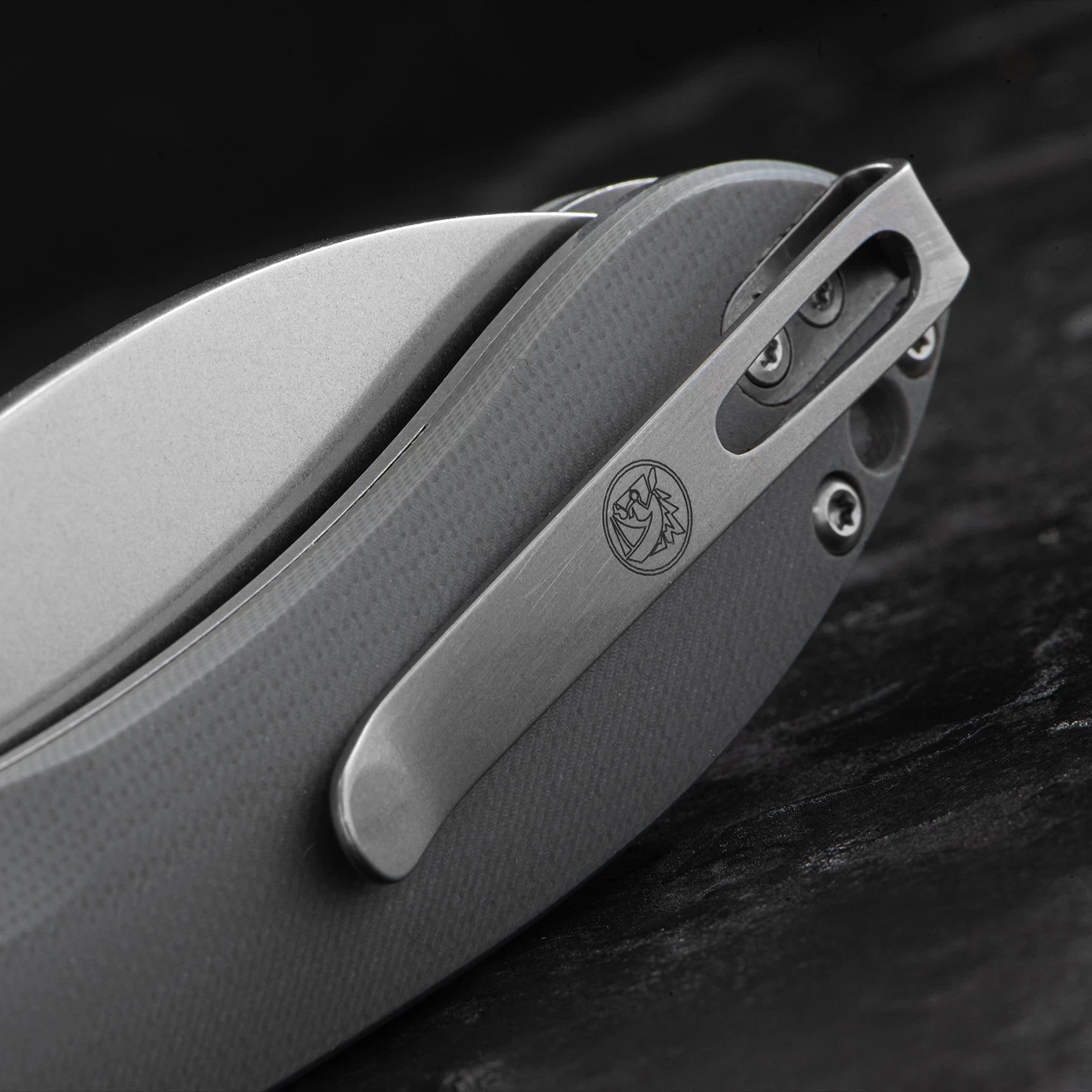 The handle is made from grey G10 with skeletonized steel liners tucked inside to improve the strength of the handle without adding too much weight.